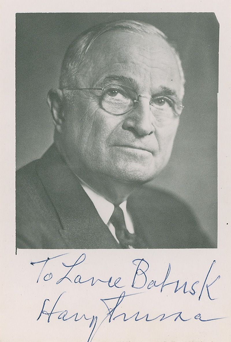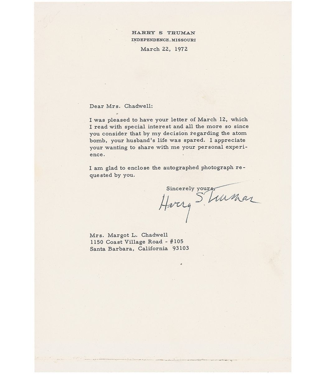 TLS, one page, 7.25 x 10.25, personal letterhead, March 22, 1972. Letter to Margot Chadwell of Santa Barbara, California. In full: “I was pleased to have your letter of March 12, which I read with special interest and all the more so since you consider that by my decision regarding the atom bomb, your husband’s life was spared. I appreciate your wanting to share with me your personal experience. I am glad to enclose the autographed photograph requested by you.” In fine condition, with some light soiling along bottom edge. Accompanied by a matte-finish 3.5 x 5 photo, signed and inscribed in blue ballpoint.
