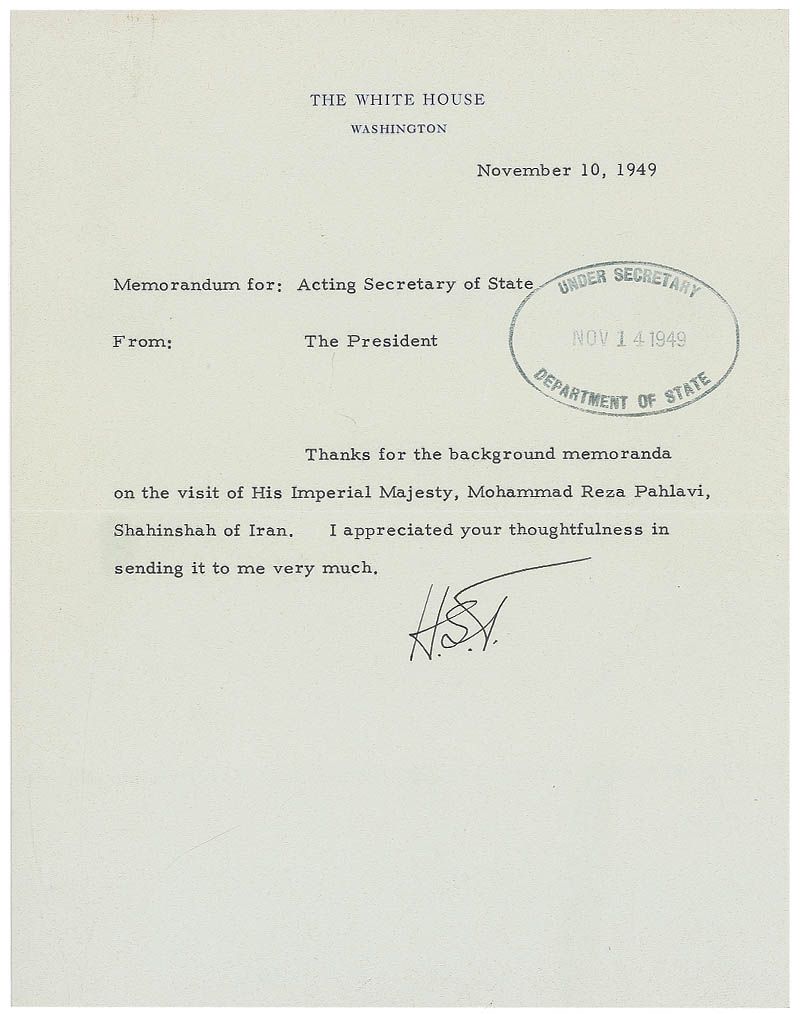 Typed memorandum, signed as president, “H.S.T.,” one page, 6.75 x 8.75, White House letterhead, November 10, 1949. Titled “Memorandum for: Acting Secretary of State From: The President,” sent to James E. Webb. In full: “Thanks for the background memoranda on the visit of His Imperial Majesty, Mohammad Reza Pahlavi, Shahanshah of Iran. I appreciated your thoughtfulness in sending it to me very much.” In fine condition, with an Undersecretary office stamp to upper right. On November 16, 1949, President Truman greeted Mohammad Reza Pahlavi, the Shah of Iran, on his first visit to the United States. The Shah was given a 21-gun salute and full military honors.