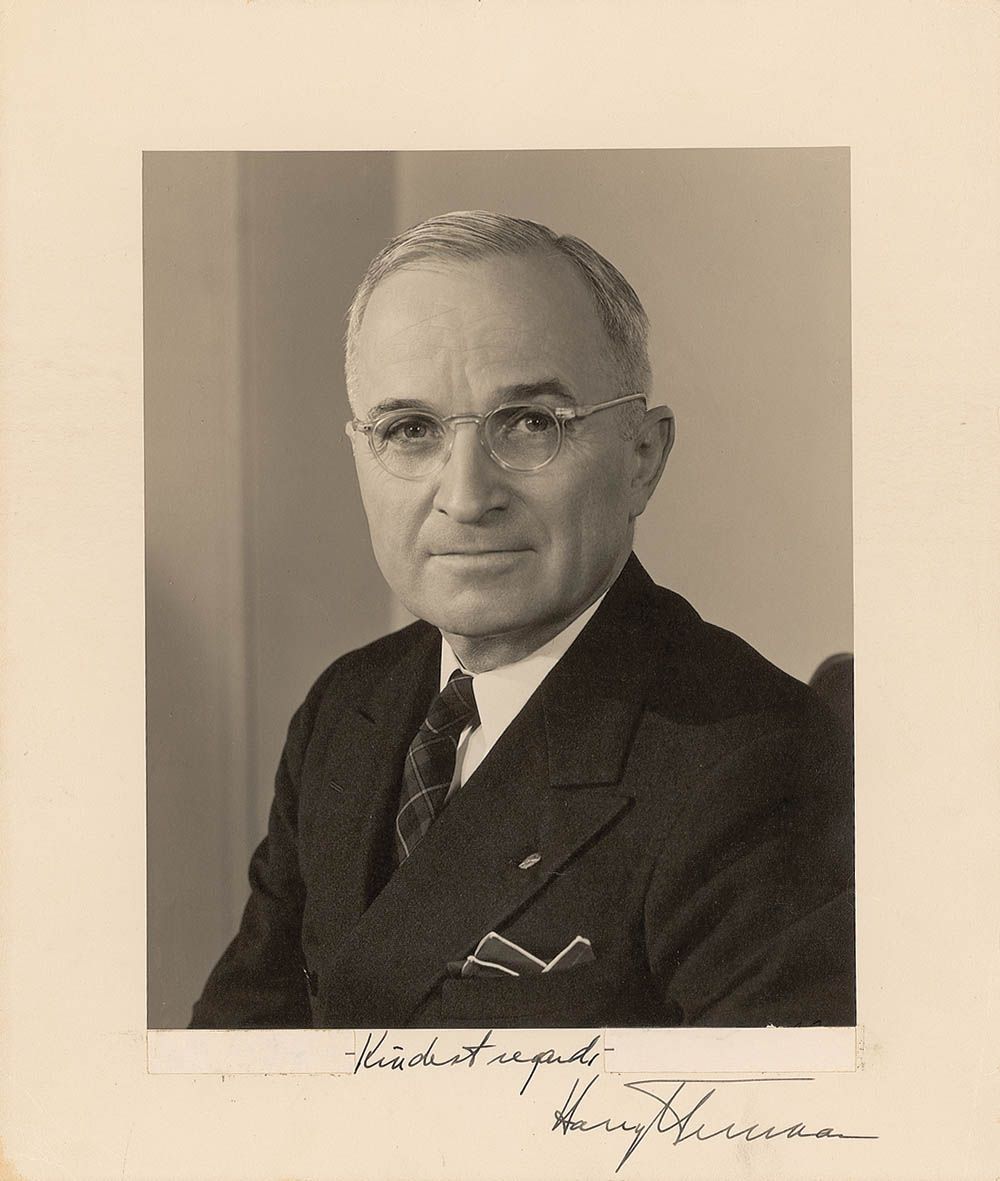 Vintage matte-finish 10.75 x 12.75 photo of Truman’s official White House portrait, signed in the lower border in fountain pen, “Kindest regards, Harry S. Truman.” In very good condition, with moderate scattered creases to the borders, a slight tear to the top edge, some silvering to the image, and two labels affixed below the image, possibly covering up an inscription.