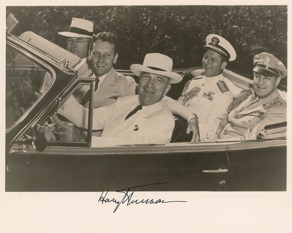 Vintage matte-finish 10 x 8 photo of Truman smiling broadly as he takes the wheel of his new convertible club coupe, with Secretary of the Treasury John W. Snyder; Stanley Woodward, Rear Admiral James H. Foskett, and Major General Harry H. Vaughan, also in the car, signed in the lower border in black ink by Truman. Matted to an overall size of 10.5 x 9.25. In fine condition.