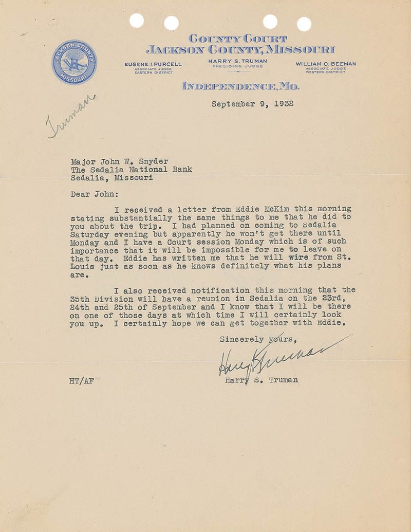 TLS, one page, 8.5 x 11, County Court Jackson County, Missouri letterhead, September 9, 1932. Letter to John W. Snyder. In part: “I received a letter from Eddie McKim…I had planned on coming to Sedalia Saturday evening but apparently he won’t get there until Monday and I have a Court session Monday which is of such importance that it will be impossible for me to leave on that day…I also received notification this morning that the 35th Division will have a reunion in Sedalia.” Horizontal mailing fold through signature, a few creases and wrinkles, and two sets of punch holes and pencil notation to top, otherwise fine condition.