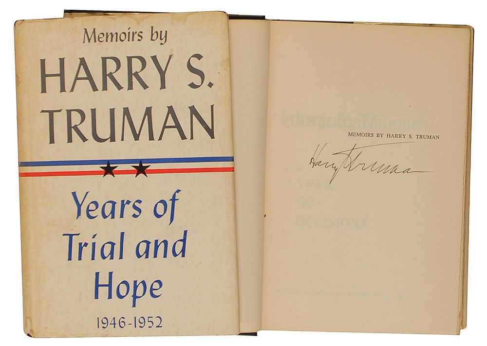 Signed book: Memoirs: Year of Decisions and Years of Trial and Hope, in two volumes. Garden City, NY: Doubleday, 1955 and 1956. Hardcover with dustjacket, 6 x 8.5, 596 and 594 pages. Signed in fountain pen on the half-title page of Volume I. Autographic condition: fine, with trivial soiling to signed page. Book condition: VG+/VG-. Two volumes in black cloth; both have minor rubbing to edges; slight yellowing to textblock edges and feps; and minimal soiling. Volume 1 has one dog-earred page and a small waterstain to upper textblock edge (only visible from exterior, not in margins). Dust jackets have small chips/tears and creases to edges; yellowing, especially along spines; light rubbing and soiling; and a few small water spots. Volume 2 has additional watermarks along edges.