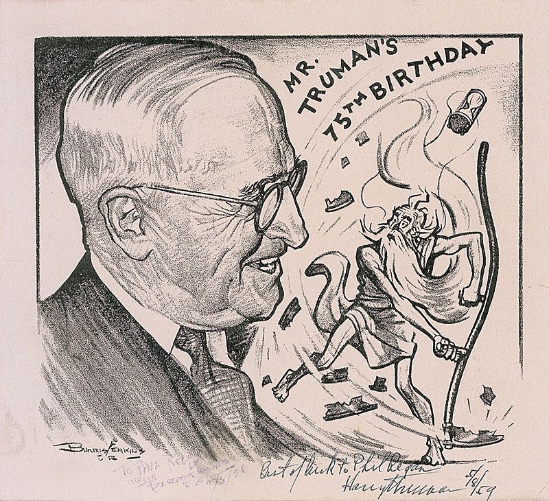 Printed political cartoon, 8.25 x 7.5, originally done by Burris Jenkins in honor of Truman’s 75th birthday, signed and inscribed at the bottom, “Best of luck to Phil Regan, Harry S. Truman 5/8/59.” Also signed and inscribed by Jenkins. Some light creasing and wrinkling, and Jenkins’s signature and inscription light, but legible, otherwise fine condition.