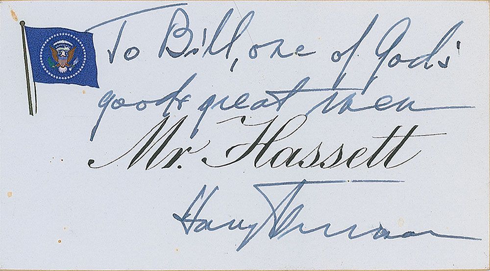 Ink signature and inscription, “To Bill, one of God’s good & great men. Harry S. Truman,” on an off-white 4.25 x 2.25 gilt-edged place card embossed in color with the presidential flag at upper left, and “Mr. Hassett” calligraphed in the center. In fine condition, with a couple of trivial spots. This place card was used aboard the presidential yacht, U.S.S. Williamsburg. Hassett served as correspondence secretary under President Truman after President Roosevelt died in 1945, serving until 1952.