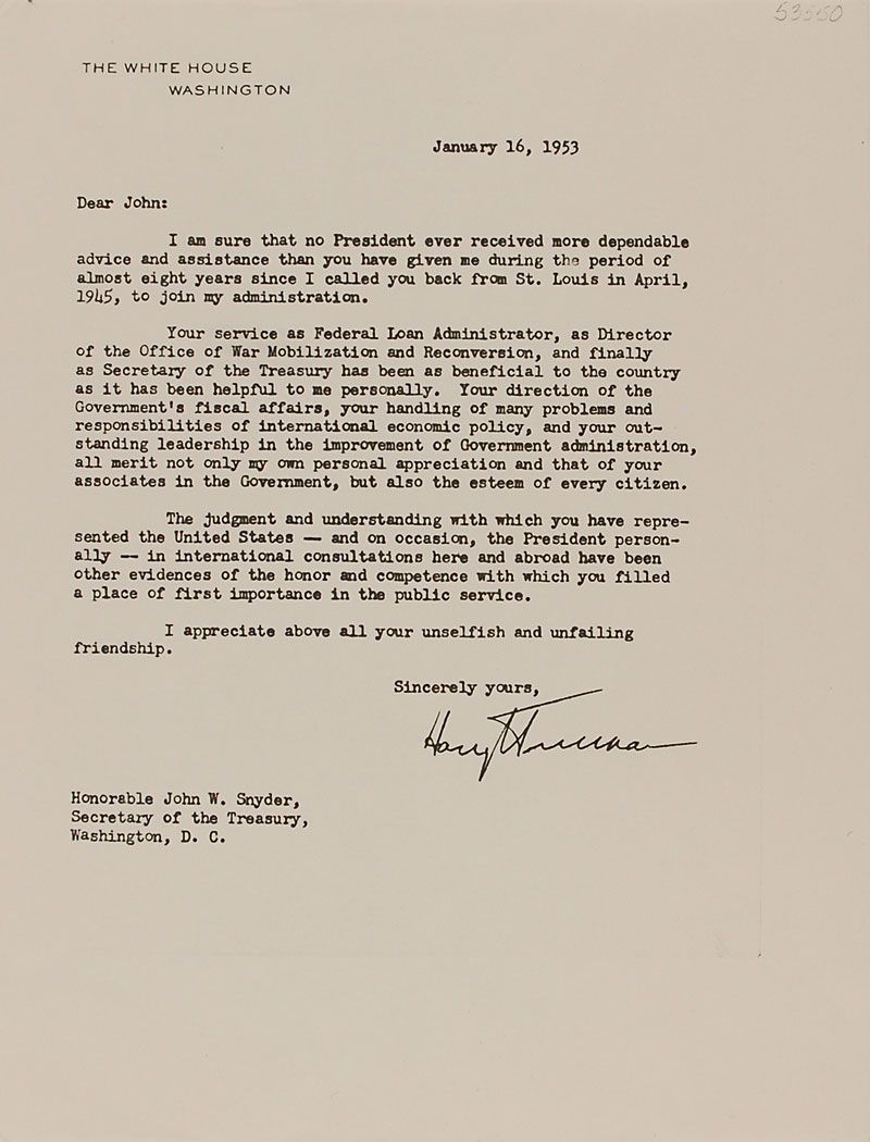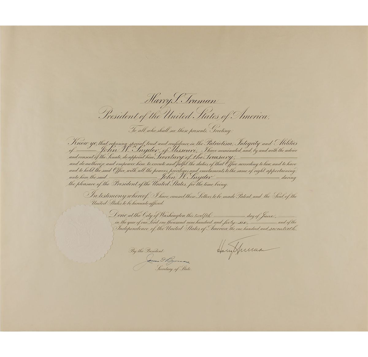 Rare partly-printed DS as president, signed “Harry S. Truman,” one page, 23 x 19, June 12, 1946. In part: In full, “Know ye, that reposing special trust and confidence in the Patriotism, Integrity and Abilities of John W. Snyder, of Missouri, I have nominated, and, by and with the advice and consent of the Senate, do appoint him Secretary of the Treasury, and do authorize and empower him to execute and fulfill the duties of that Office according to law, and to have and to hold the said Office, with all the powers, privileges and emoluments to the same of right appertaining, unto him the said John W. Snyder during the pleasure of the President of the United States, for the time being.” Signed at the conclusion by Truman and countersigned by Secretary of State James F. Byrnes. In fine condition, with some mild wrinkling and a couple trivial spots. Accompanied by a photocopy of a 1953 letter, written four days before the end of his term, in which Truman praises Snyder and assures him that ‘no President ever received more dependable advice and assistance than you have given me.’