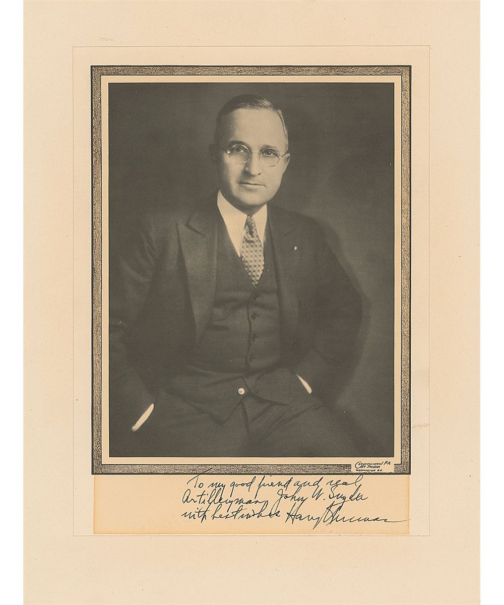 Vintage print of a portrait of a young Truman in a three-piece suit, 8 x 11, signed and inscribed in the lower border in black ink, “To my good friend and real Artilleryman John W. Snyder, with best wishes, Harry S. Truman.” Matted to an overall size of 10.5 x 14. In fine condition, with uniform toning to lower border from previous display.