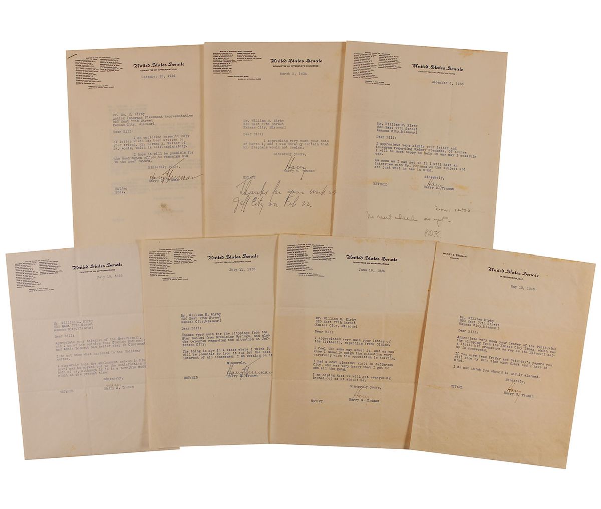Collection of seven TLSs, five signed "Harry," and two signed "Harry S. Truman," all one page, all 8 x 10.5, United States Senate letterhead, dating from May 13, 1935–December 10, 1936, all to William M. Kirby in Kansas City, Missouri, who was the Acting Veterans Placement Representative. Letters read: