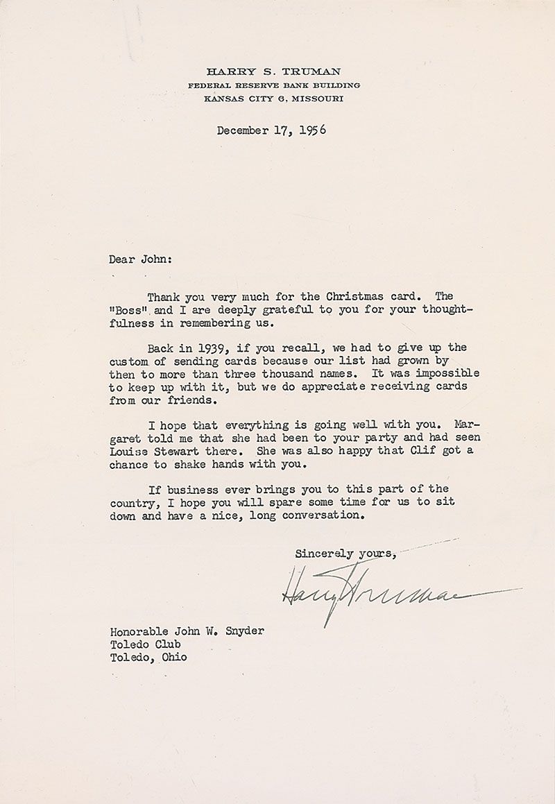 TLS, one page, 7.25 x 10.5, personal letterhead, December 17, 1956. Letter to his former treasury secretary. In part: “Thank you very much for the Christmas card. The ‘Boss’ and I are deeply grateful to you for your thoughtfulness in remembering us. Back in 1939, if you recall, we had to give up the custom of sending cards because our list had grown by then to more than three thousand names. It was impossible to keep up with it, but we do appreciate receiving cards from our friends.” In fine condition, with a paperclip impression to top edge.