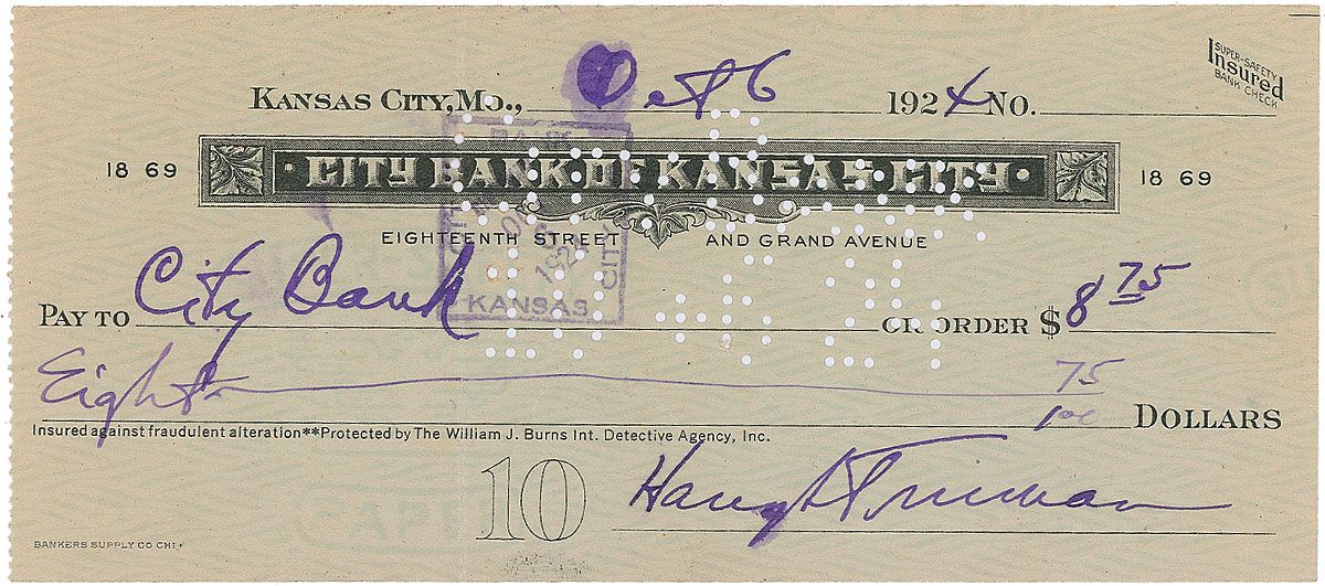 Bank check, 6.25 x 2.5, filled out and signed by Truman, payable to City Bank for $8.75, October 6, 1924. A vertical fold, expected stamps and holes, and a spot of trivial ink spreading to signature, otherwise fine condition.