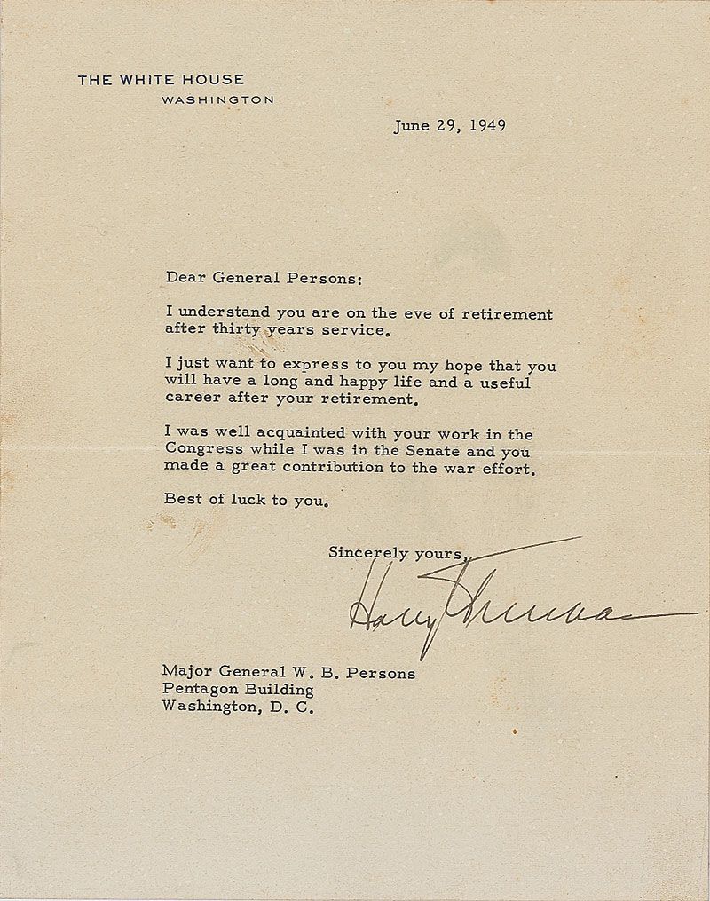 TLS as president, one page, 7 x 8.75, White House letterhead, June 29, 1949. Letter to General W. B. Persons. In part: “I understand you are on the eve of retirement after thirty years service. I just want to express to you my hope that you will have a long and happy life and a useful career after your retirement. I was well acquainted with your work in the Congress while I was in the Senate and you made a great contribution to the war effort.” In fine condition, with a bit of scattered light soiling, not affecting the signature or legibility.