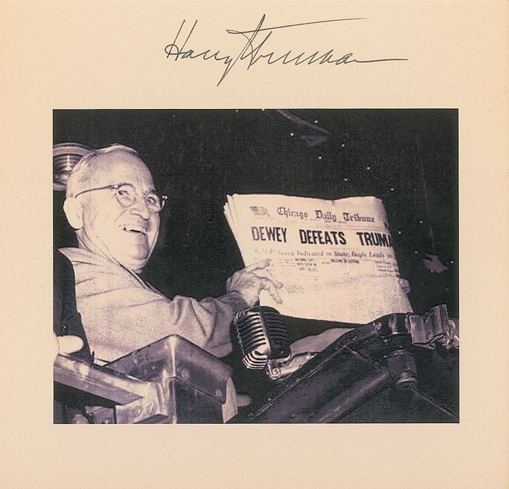 Ballpoint signature, “Harry S. Truman,” on an off-white 6 x 6 card to which was later added a printed image of Truman holding up the memorable ‘Dewey Defeats Truman’ issue of the Chicago Tribune. In fine condition.
