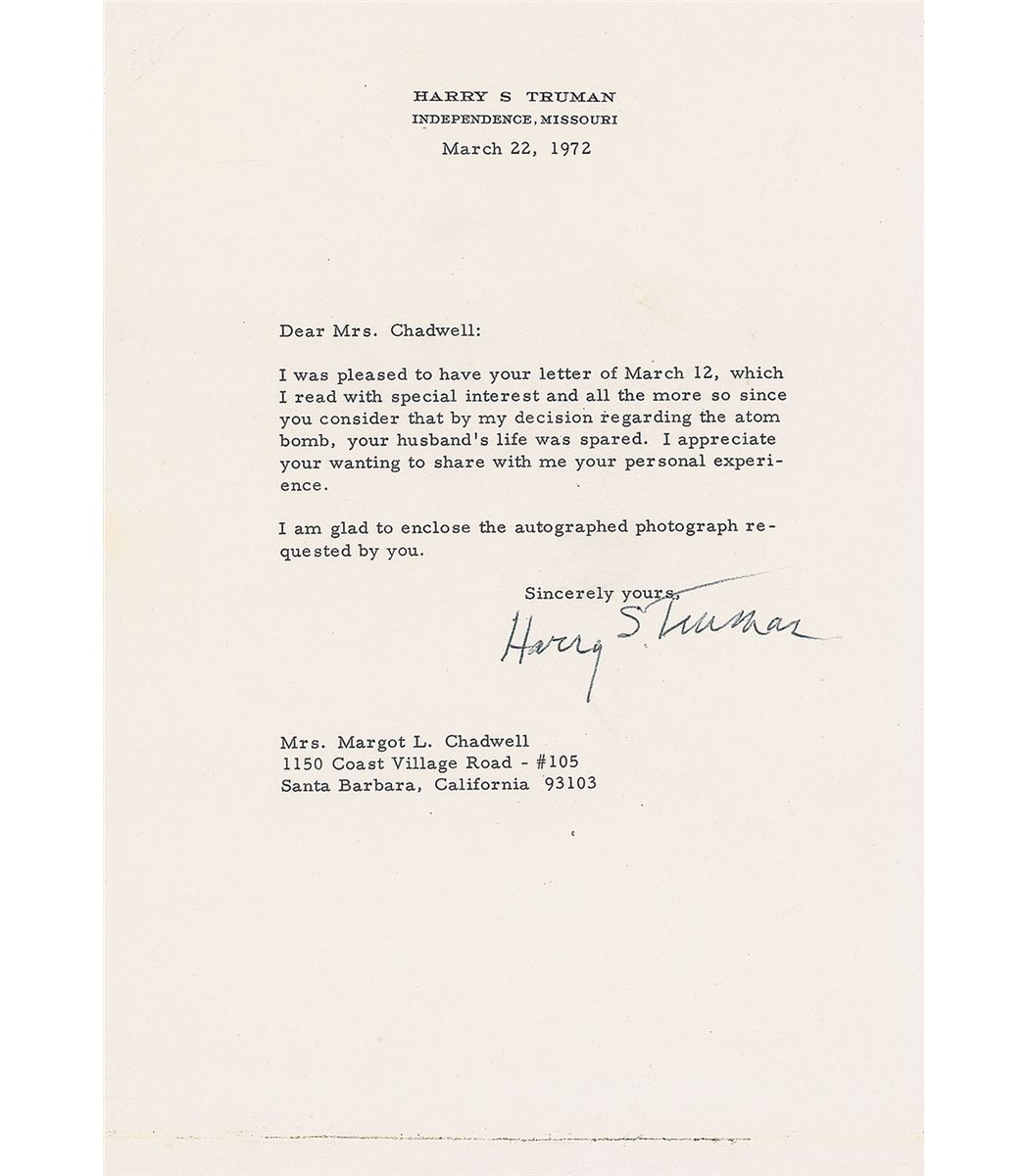 TLS, one page, 7.25 x 10.25, personal letterhead, March 22, 1972. Letter to Margot Chadwell of Santa Barbara, California. In full: “I was pleased to have your letter of March 12, which I read with special interest and all the more so since you consider that by my decision regarding the atom bomb, your husband’s life was spared. I appreciate your wanting to share with me your personal experience. I am glad to enclose the autographed photograph requested by you.” In fine condition, with some light soiling along bottom edge which could be easily matted out. Accompanied by a matte-finish 3.5 x 5 photo, signed and inscribed in blue ballpoint.