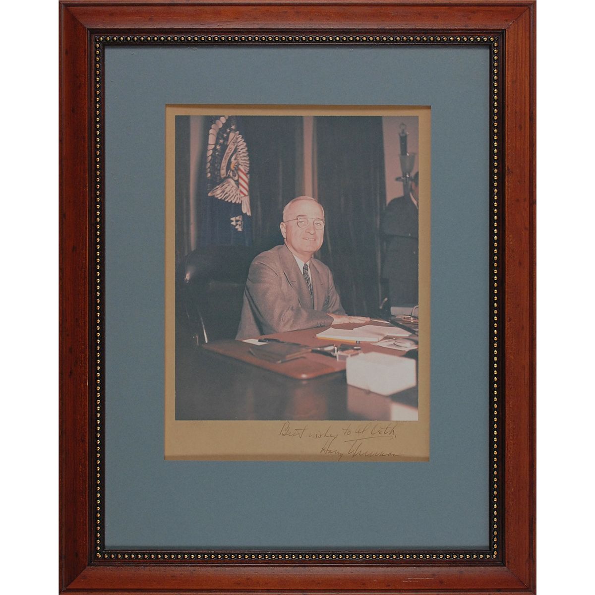 Color vintage 7.75 x 9.75 photo of Truman at his desk in the Oval Office, affixed to an 8.5 x 11.5 mount, signed and inscribed on the mount in black ink “Best wishes to Al Oeth, Harry S. Truman.” Matted and framed to an overall size of 15.75 x 20. In fine condition. Oeth was a correspondent for Paramount News and traveled with Truman to Key West in 1948.