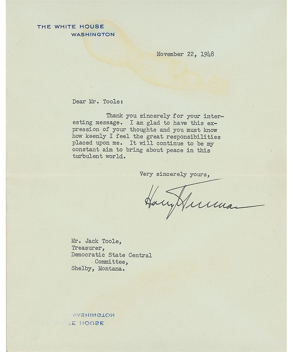TLS as president, one page, 7 x 9, White House letterhead, November 22, 1948. Letter to Jack Toole, treasurer of Montana’s Democratic State Central Committee. In full: “Thank you sincerely for your interesting message. I am glad to have this expression of your thoughts and you must know how keenly I feel the great responsibilities placed upon me. It will continue to be my constant aim to bring about peace in this turbulent world.” In very good condition, with some mirroring of letterhead to bottom of page and an area of dampstaining to upper portion, not affecting text or signature.