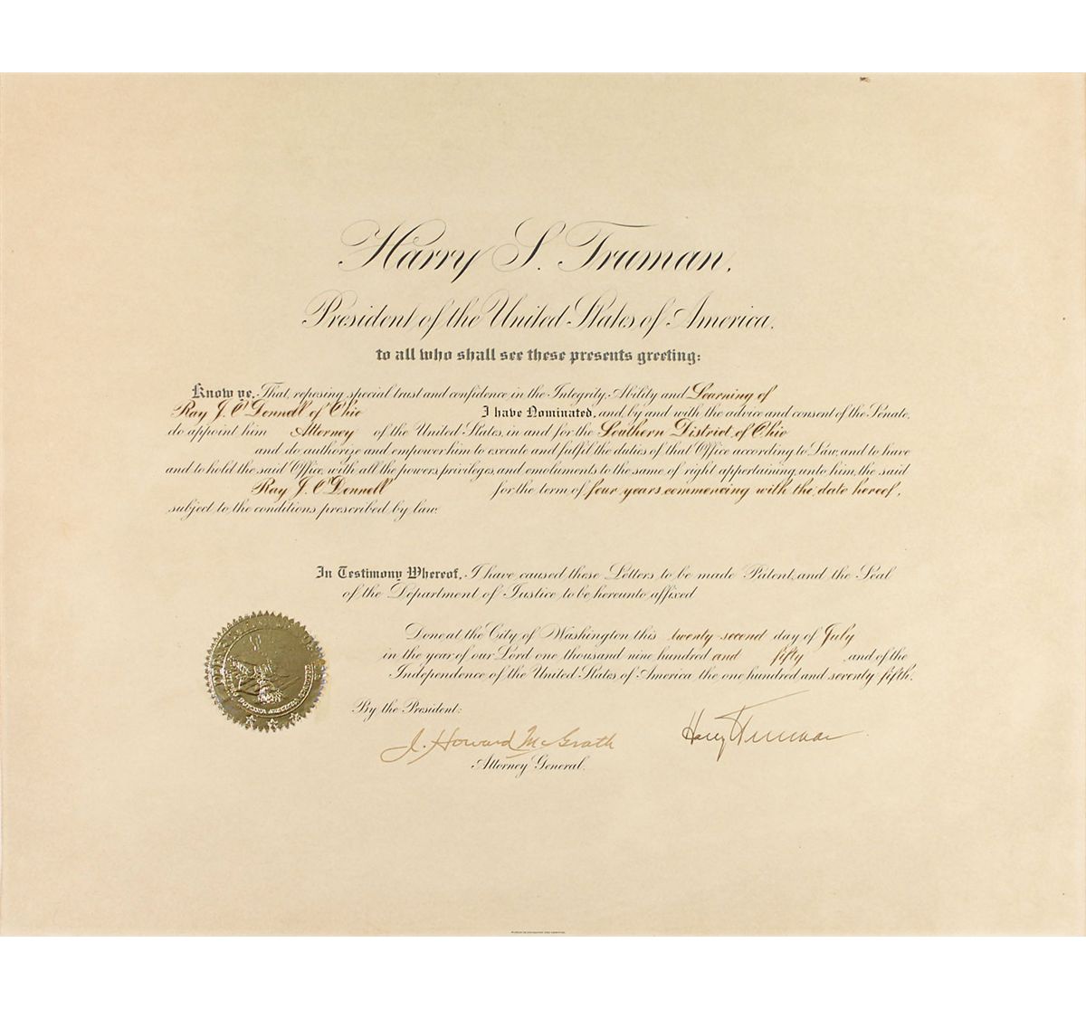 Partly-printed DS as president, one page, 20 x 16, July 22, 1950. President Truman appoints Ray J. O’Donnell as “Attorney of the United States in and for the Southern District of Ohio.” Signed at the conclusion by Truman and countersigned by Attorney General J. Howard McGrath. Affixed to a same-size mount. Seal affixed to the lower right remains fully intact with light wear to gold tips. In fine condition, with light overall toning and slightly trimmed edges.