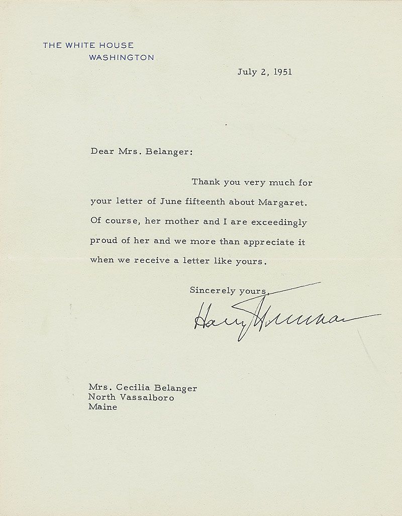 TLS as president, one page, 7 x 8.75, White House letterhead, July 2, 1951. Letter to Cecilia Belanger. In full: “Thank you very much for your letter…about Margaret. Of course, her mother and I are exceedingly proud of her and we more than appreciate it when we receive a letter like yours.” In fine condition. Several months earlier, Margaret appeared on the cover of Time magazine.