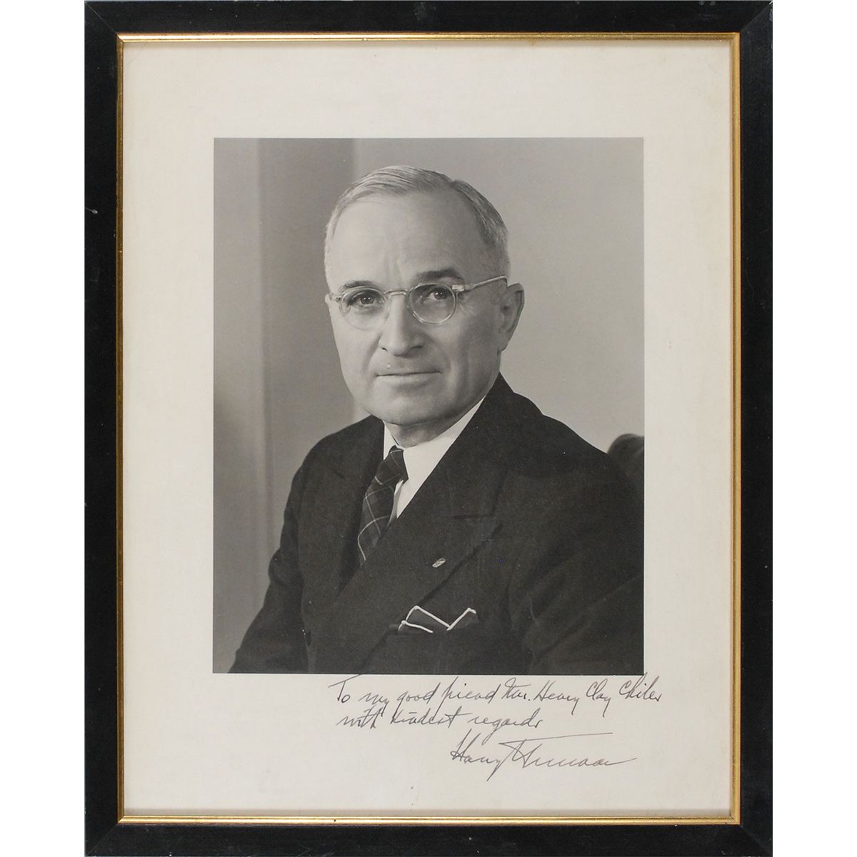 Vintage matte-finish 10.5 x 13.5 head-and-shoulders photo, signed and inscribed in the lower border in fountain pen, “To my good friend Mrs. Henry Clay Chiles, with kindest regards, Harry S. Truman.” Framed to an overall size of 12 x 15. In fine condition, with some scattered light creases to borders.