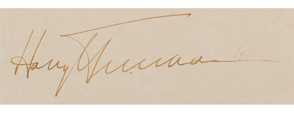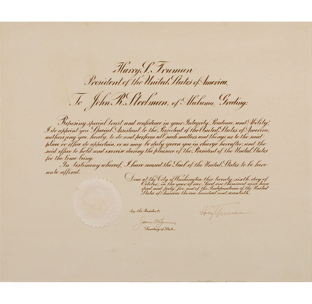 DS as president, one page, 23 x 19, October 26, 1945. Truman appoints John R. Steelman to be a “Special Assistant to the President of the United States of America.” Signed at the conclusion by Truman and countersigned by Secretary of State James Byrnes. Document is affixed to an identical size mount. In fine condition, with some mild haloing to the bold text and a bit of scattered light toning and soiling. The white wafer seal is lightly toned, but crisp and intact. Steelman was the first Assistant to the President of the United States—the precursor to the White House Chief of Staff—serving Truman from 1946 to 1953. He was the longest serving Chief of Staff, holding office for six years, and the only such to serve the full term of a president. Truman presidential appointments are quite scarce, particularly for such high-level positions.