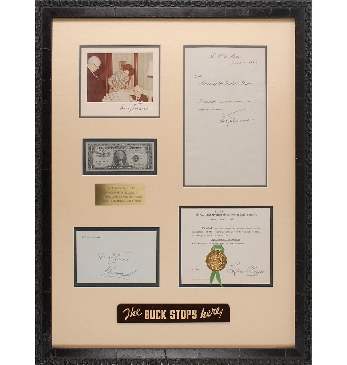 Lovely display of six items, featuring an uncirculated Series 1935C silver certificate, engraved with the signatures of United States Treasurer W. A. Julian and Secretary of the Treasury John W. Snyder, signed in black ink on the portrait side by Truman and presented to Snyder; and a color 6 x 4.5 informal photo affixed to a 7 x 6.25 mount, picturing the former president in his 80s, and his Secretary of the Treasury holding an uncut sheet of $1 bills, signed on the mount in blue ballpoint. Also included is a pale green White House envelope, 7.25 x 4.25, addressed in Truman’s hand, “Sec. of Treas, Personal”; a partly-printed document, 8 x 6.75, noted in type “Copy,” but signed in ink by Leslie L. Biffle, appointing Snyder to the position of Secretary of the Treasury; and an 8 x 13.5 reproduction of Truman’s June 6, 1946, nomination of Snyder to be Secretary of the Treasury; a replica sign of Truman’s saying, “The buck stops here,” obtained from the Harry S. Truman Library and Museum. All are cloth-matted and framed along with a small plaque to an overall size of 25 x 33. In fine condition. Provenance: the Estate of John W. Snyder.