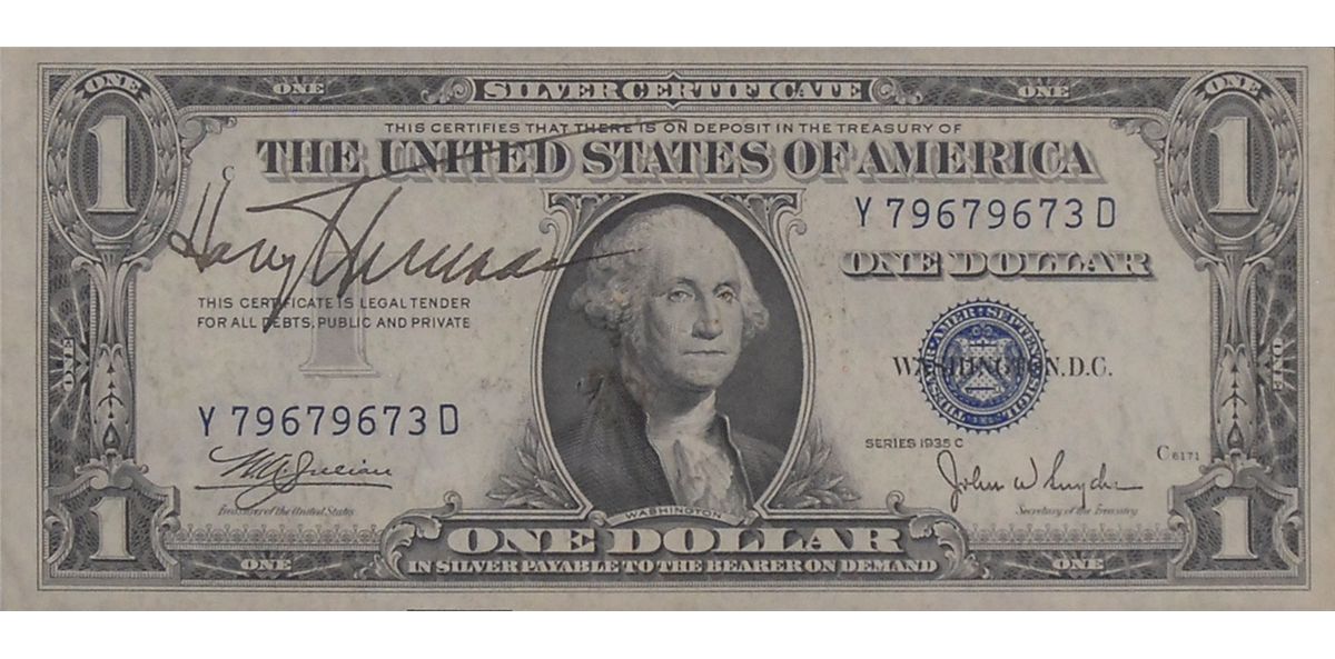 On June 25, 1946, John Snyder was sworn in as Secretary of the Treasury by his personal friend, President Harry S. Truman, with whom he had served in World War I. When his new aides surprised him with a gift of twelve crisp one-dollar bills engraved with his signature, the new secretary expressed his amazement with reporters, saying, ‘I didn’t know the Treasury worked so fast!’ Printed by the Bureau of Engraving between his June 11th confirmation and his swearing in two weeks later, the Series 1935C bills marked the start of his challenging new position, in which he would work diligently to establish a stable postwar economy. Any currency signed by Truman is exceedingly rare, this being the first we have offered; with the additional interest of Snyder’s important place in his Cabinet and the collection of personal items relating the two, this is an exceptional piece. Oversized.