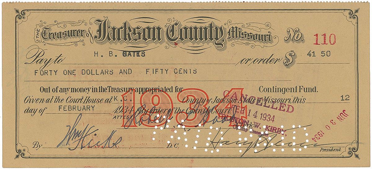 Jackson County Treasurer’s check, 8 x 3.5, filled out in type and signed by Truman, payable to H. B. Gates for $41.50, February 12, 1934. In very good condition, with cancellation holes and bank stamp over signature.