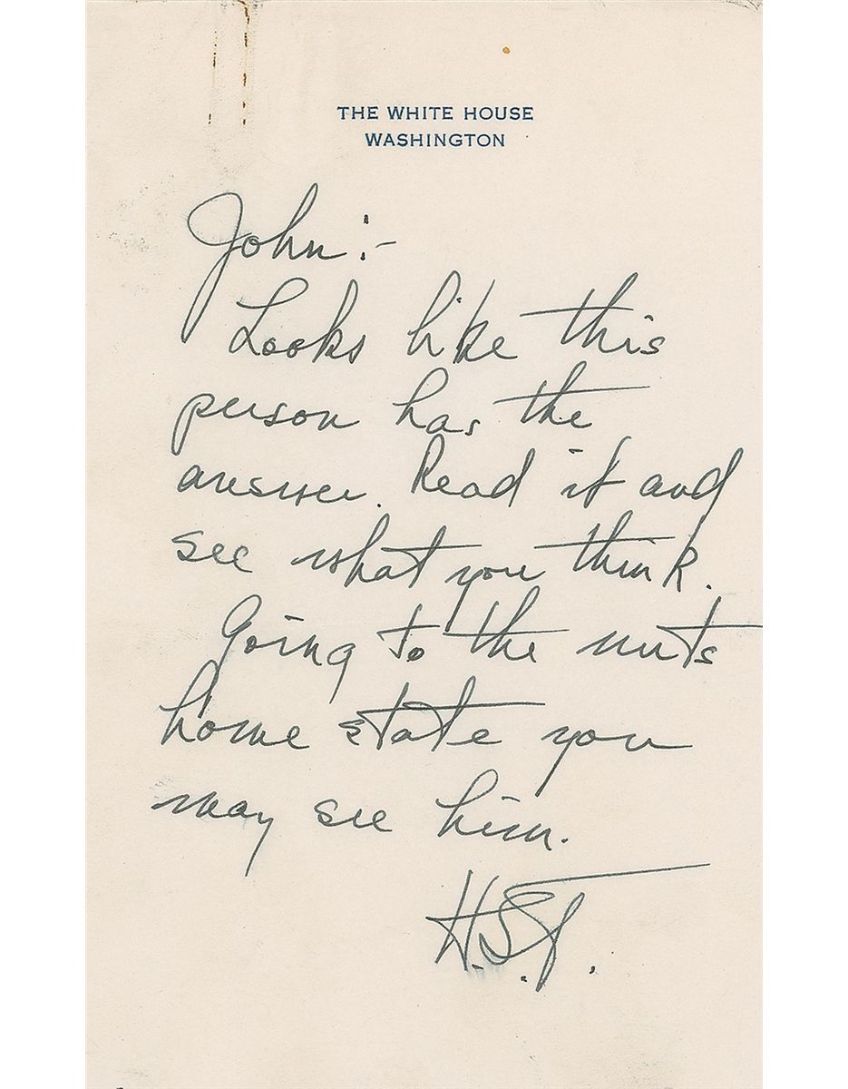 ANS as president signed “H. S. T.,” one page, 5 x 8, White House letterhead, no date. Note to Secretary of the Treasury John Snyder concerning a lengthy letter written to Truman from a Stockton, California, inventor. Truman writes: “Looks like this person has the answer. Read it and see what you think. Going to the nuts home state you may see him.”