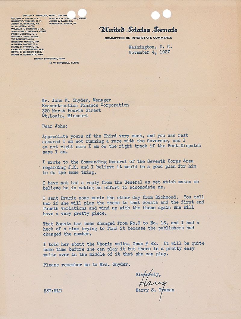 TLS signed “Harry,” one page, 8 x 10.5, United States Senate letterhead, November 4, 1937. Letter to John W. Snyder. In part: “You can rest assured I am not running a race with the Governor, and I am not right sure I am on the right track if the Post-Dispatch says I am. I wrote to the Commanding General of the Seventh Corps Area regarding J. K. and I believe it would be a good plan for him to do the same thing. I have not had a reply from the General as yet which makes me believe he is making an effort to accommodate me. I sent Drucie, some music the other day from Richmond. You tell her if she will play the theme to that Sonata and the first and fourth variations and wind up with the theme again she will have a very pretty piece. That Sonata has been changed from No. 9 to No. 16, and I had a heck of a time trying to find it because the publishers had changed the number. I told her about the Chopin waltz, Opus #42. It will be quite some time before she can play it but there is a pretty easy waltz over in the middle of it that she can play.” In fine condition, with filing holes to the top.