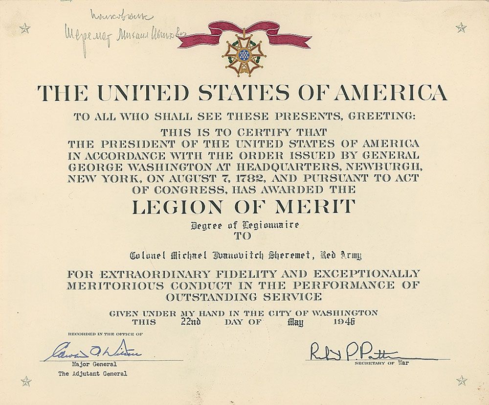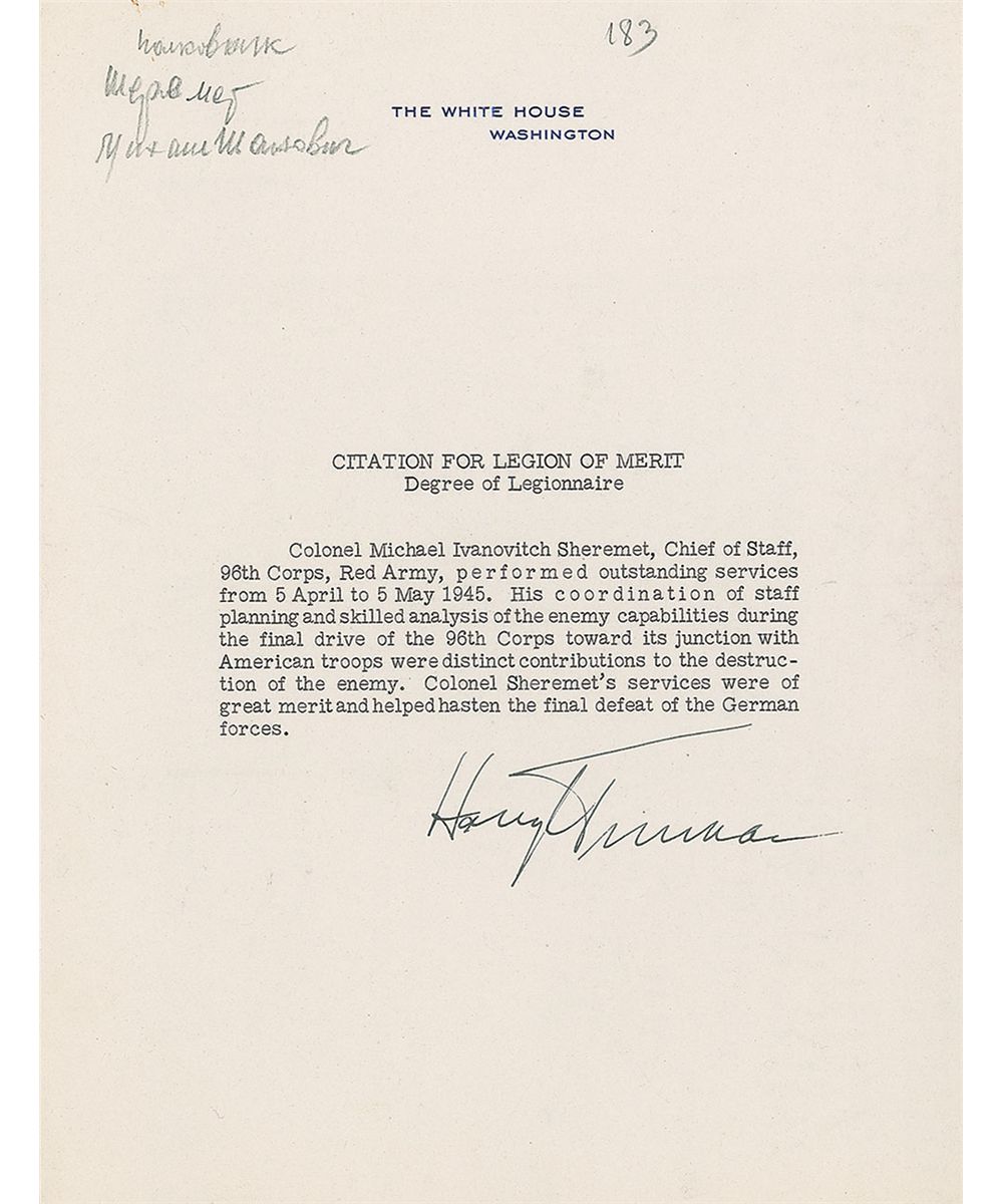 DS as president, one page, 8 x 10.5, no date. President Truman awards Colonel Michael Ivanovitch Sheremet the Legion of Merit for “his coordination of staff planning and skilled analysis of the enemy capabilities during the final drive of the 96th Corps towards its junction with American troops…Colonel Sheremet’s services were of great merit and helped hasten the final defeat of the German forces.” In fine condition, with pencil notations to top portion. Accompanied by the Legion of Merit certificate issued to Sheremet, dated May 22, 1946, signed by the secretary of war and the adjutant general.