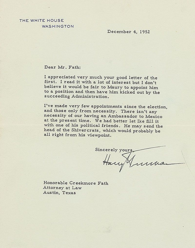 TLS, one page, 7 x 9, White House letterhead, December 4, 1952. Letter to Creekmore Fath. In part: “I don’t believe it would be fair to Maury to appoint him to a position and then have him kicked out by the succeeding Administration. I’ve made very few appointments since the election, and those only from necessity. There isn’t any necessity of our having an Ambassador to Mexico at the present time. We had better let Ike fill it with one of his political friends. He may send the head of the Shivercrats, which would probably be all right from his viewpoint.” In fine condition. Accompanied by the original mailing envelope.