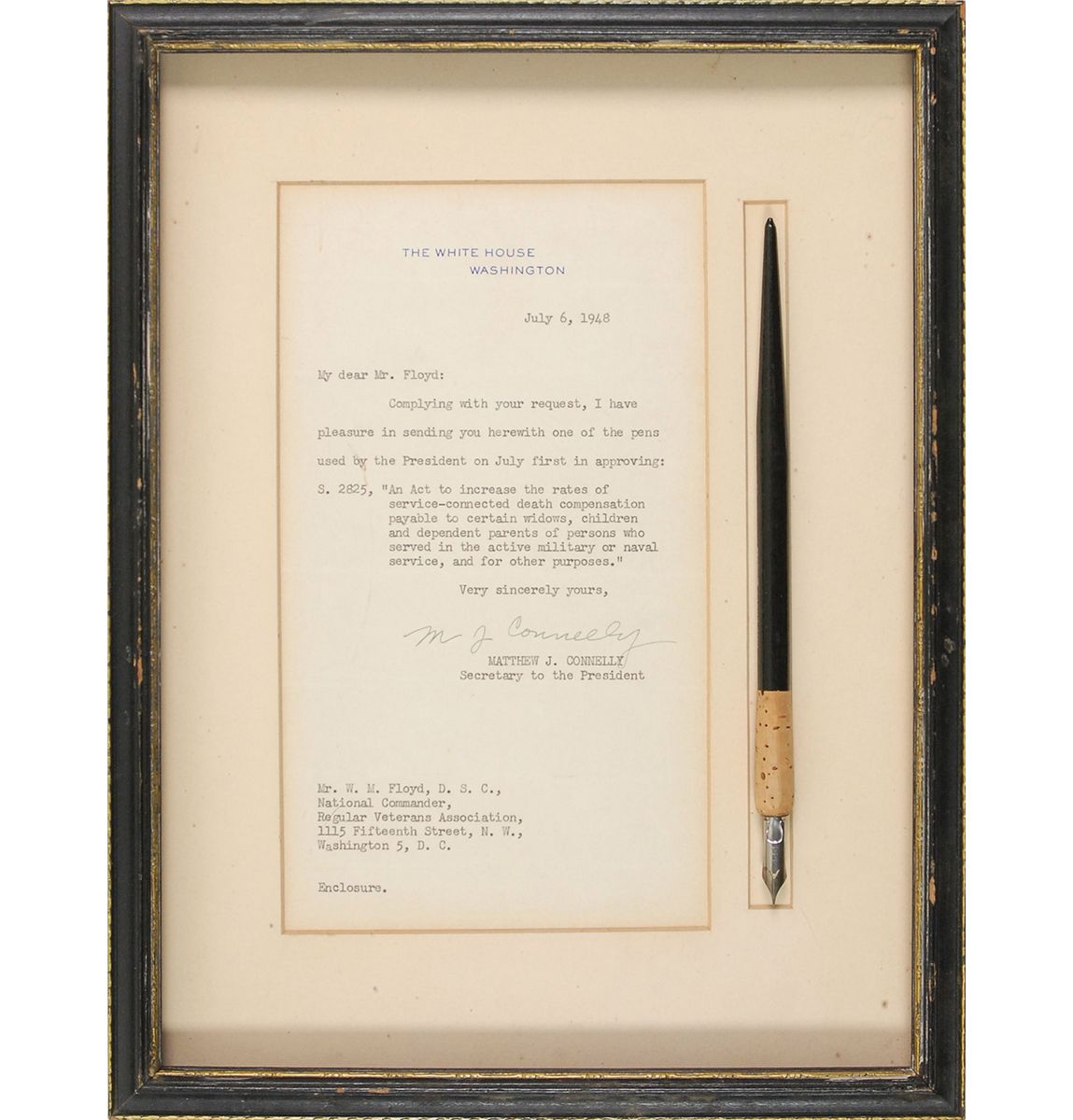 Dipping pen used by President Truman to sign a bill to increase compensation for family hardships caused by deaths in the military passed by the House of Representatives on June 14, 1948. The black wooden pen measures 8? long and features a cork grip, with the manufacturer’s stamp on the side, reading, “1015 Eagle Cortex, Made U. S. A.” Includes the transmittal letter sent by Secretary to the President Matthew J. Connelly to Mr. W. M. Floyd, national commander of the Regular Veterans Association. In full: “Complying with your request, I have pleasure in sending you herewith one of the pens used by the President on July first in approving: S. 2825, ‘An Act to increase the rates of service-connected death compensation payable to certain widows, children and dependent parents of persons who served in the active military or naval service, and for other purposes.” Mounted, matted, and framed together to an overall size of 10 x 13. In fine condition.