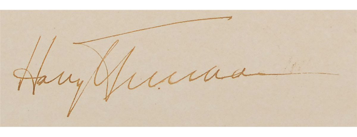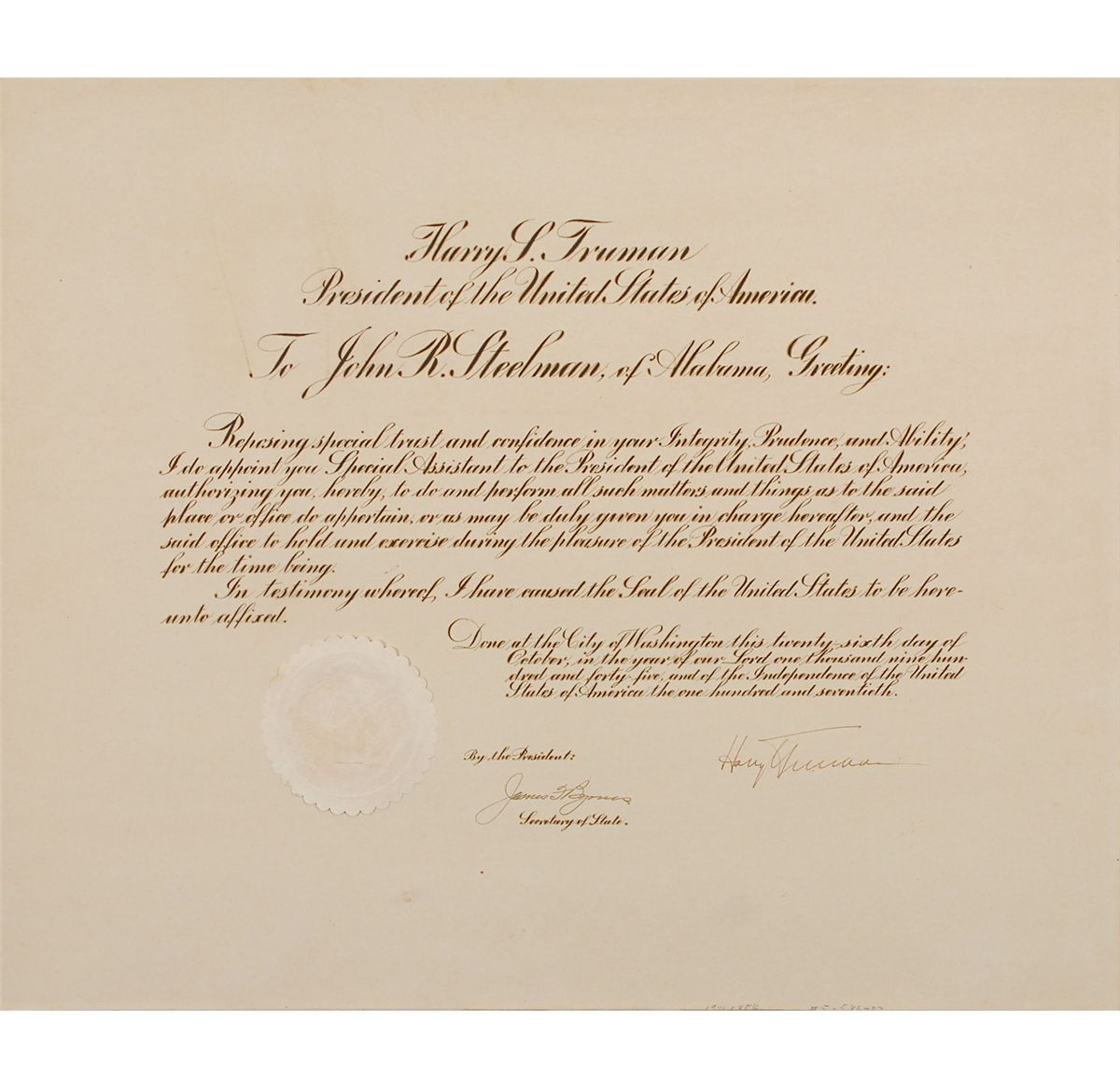 DS as president, one page, 23 x 19, October 26, 1945. Truman appoints John R. Steelman to be a “Special Assistant to the President of the United States of America.” Signed at the conclusion by Truman and countersigned by Secretary of State James Byrnes. Document is affixed to an identical size mount. In fine condition, with some mild haloing to the bold text and a bit of scattered light toning and soiling. The white wafer seal is lightly toned, but crisp and intact. Steelman was the first Assistant to the President of the United States—the precursor to the White House Chief of Staff—serving Truman from 1946 to 1953. He was the longest serving Chief of Staff, holding office for six years, and the only such to serve the full term of a president. Truman presidential appointments are quite scarce, particularly for such high-level positions.