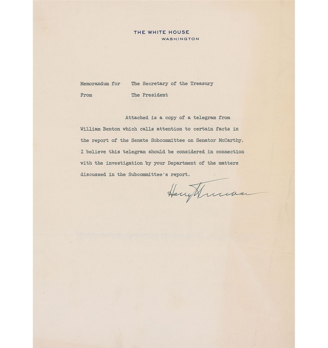 Typed memorandum, signed as president, one page, 8 x 10.5, White House letterhead, no date. Headed at the top, “Memorandum for The Secretary of the Treasury; From The President.” In full: “Attached is a copy of a telegram from William Benton which calls attention to certain facts in the report of the Senate Subcommittee on Senator McCarthy. I believe this telegram should be considered in connection with the investigation by your Department of the matters discussed in the Subcommittee’s report.” Vertical creasing and light toning to right side, lightly affecting last few letters of signature, otherwise fine condition. Benton, a Connecticut senator, introduced ten ‘case studies’ supporting his resolution to expel McCarthy from the Senate, including a suspicious $10,000 fee from the Lustron Corporation and various income tax irregularities. Benton’s telegram to Truman undoubtedly was sent before he introduced his case studies, which would interest the Treasury Department. The Gillette Committee eventually voted unanimously to investigate Benton’s accusations. An intriguing memo in the midst of the ‘Red Scare.’