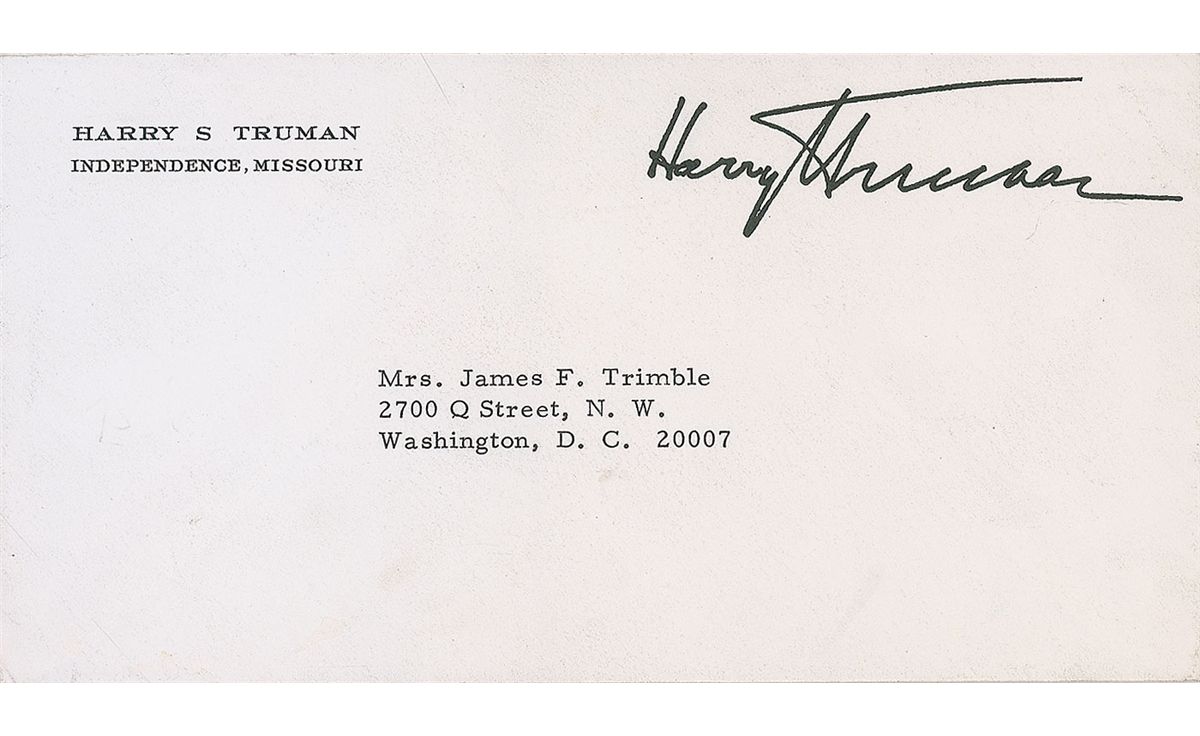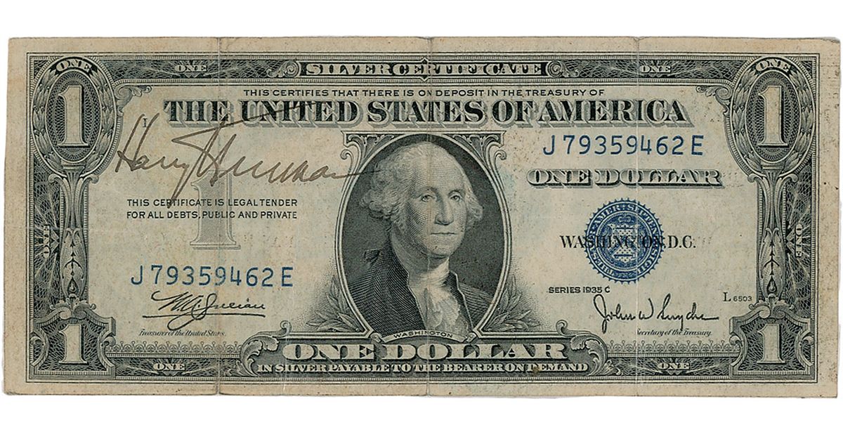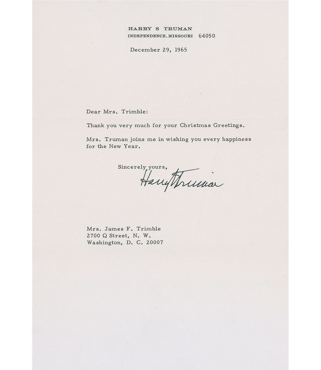 Series 1935 C silver certificate one dollar bill, signed on the portrait side in fountain pen and laminated for protection; and a TLS, one page, 7.25 x 10.5, personal letterhead, December 29, 1965, returning Christmas greetings. Intersecting folds to the dollar bill (one vertical fold passing through a single letter of the signature) and aforementioned lamination, otherwise overall fine condition. Accompanied by the original mailing envelope, bearing a pre-printed facsimile franking signature. A nice pairing of items, bringing to mind Truman’s famous desk sign, ‘The buck stops here!’