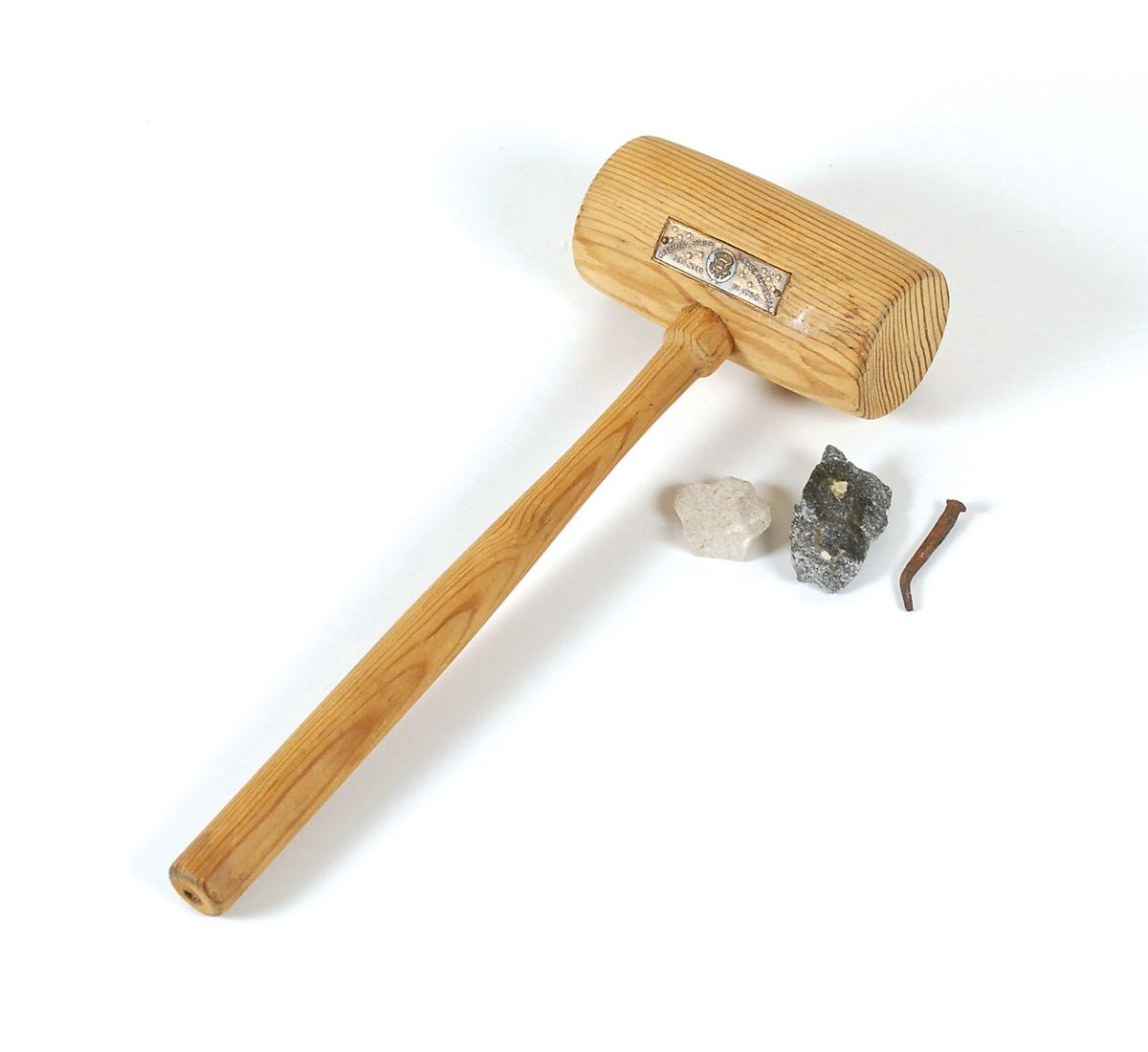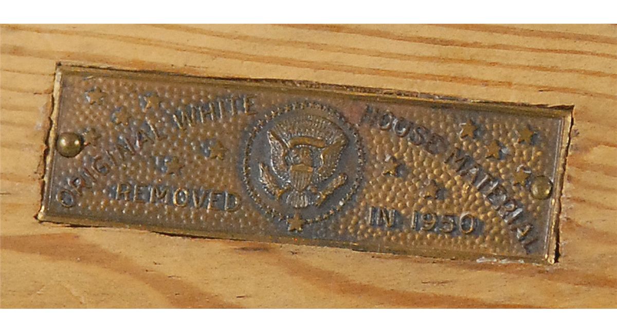 Gavel constructed of wood removed from the White House during renovations in 1950, measuring 12? long with a cylindrical 4.5 x 2 head, with an inlaid metal plaque featuring a raised presidential seal in the center, reading: “Original White House Material Removed in 1950.” Also includes two chunks of cement and a nail procured from the White House during the renovation. In fine condition, with various marks and dings. During President Truman’s time in office, the White House underwent one of its largest restoration projects. Some of the original wood from the foundation of the White House was used to craft souvenir gavels that Truman would present to visiting dignitaries and other VIPs.