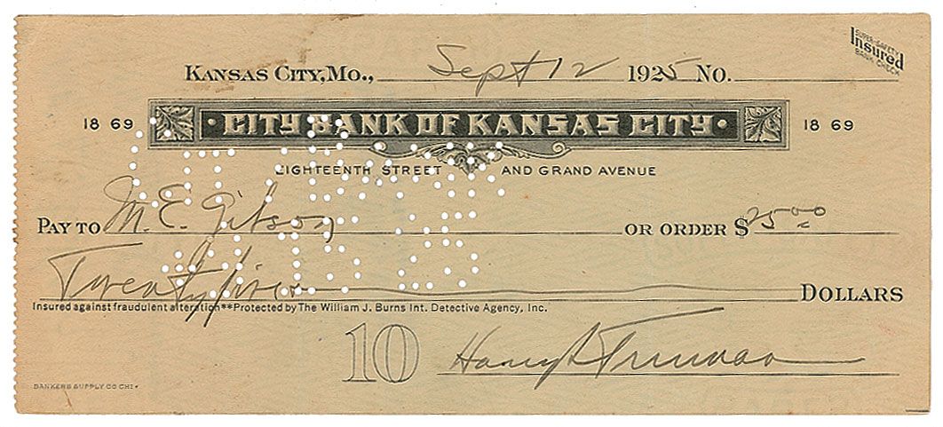 Bank check, 6.25 x 2.75, filled out and signed by Truman, payable to M. E. Gibson for $25, September 12, 1925. Two vertical folds (one passing through a single letter of the signature), expected cancellation holes, and a few light stains, otherwise fine condition.