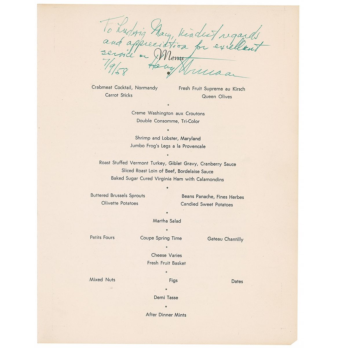 Three signed menus: one for the 1950 National Press Club Annual Fathers and Daughters Dinner, signed and inscribed as president in pencil; one for a 1957 testimonial dinner honoring Frank S. Land, signed in fountain pen; and one for a dinner aboard the SS Constitution cruise ship, signed and inscribed in ballpoint, and dated 1958. In overall very good to fine condition, with some staining to the testimonial dinner menu. Accompanied by one unsigned National Press Club dinner menu from 1948.