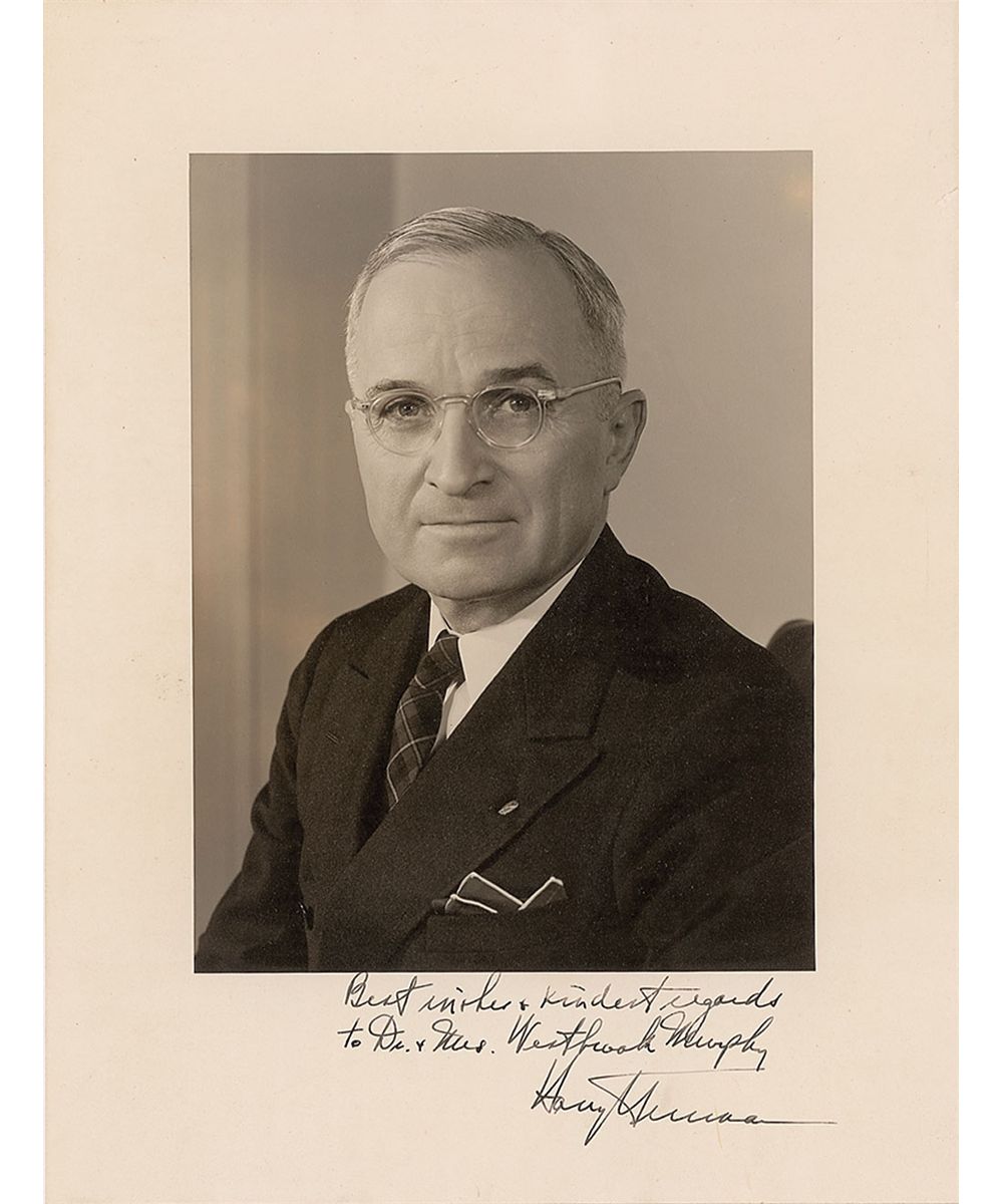 Distinguished matte-finish 10.5 x 13.75 portrait of Truman, boldly signed and inscribed in the lower border in fountain pen, “Best wishes & kindest regards to Dr. & Mrs. Westbrook Murphy, Harry S. Truman.” Mild rippling to edges and a noticeable ding to right edge, otherwise fine condition. A fine image of the president.