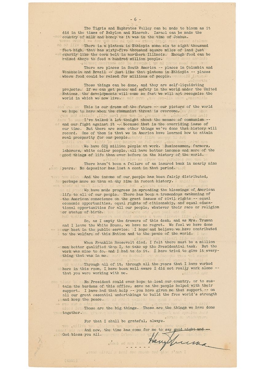 So, as I empty the drawers of this desk, and as Mrs. Truman and I leave the White House, we have no regret. We feel we have done our best in the public service. I hope and believe we have contributed to the welfare of this Nation and to the peace of the world. When Franklin Roosevelt died, I felt there must be a million men better qualified than I, to take up the Presidential task. But the work was mine to do, and I had to do it. And I have tried to give it everything that was in me. Through all of it, through all the years that I have worked here in this room, I have been well aware I did not really work alone—that you were working with me. No President could ever hope to lead our country, or to sustain the burdens of this office, save as the people helped with their support. I have had that help—you have given me that support—on all our great essential undertakings to build the free world's strength and keep the peace. Those are the big things. Those are the things we have done together. For that I shall be grateful, always. And now, the time has come for me to say good night—and God bless you all.”