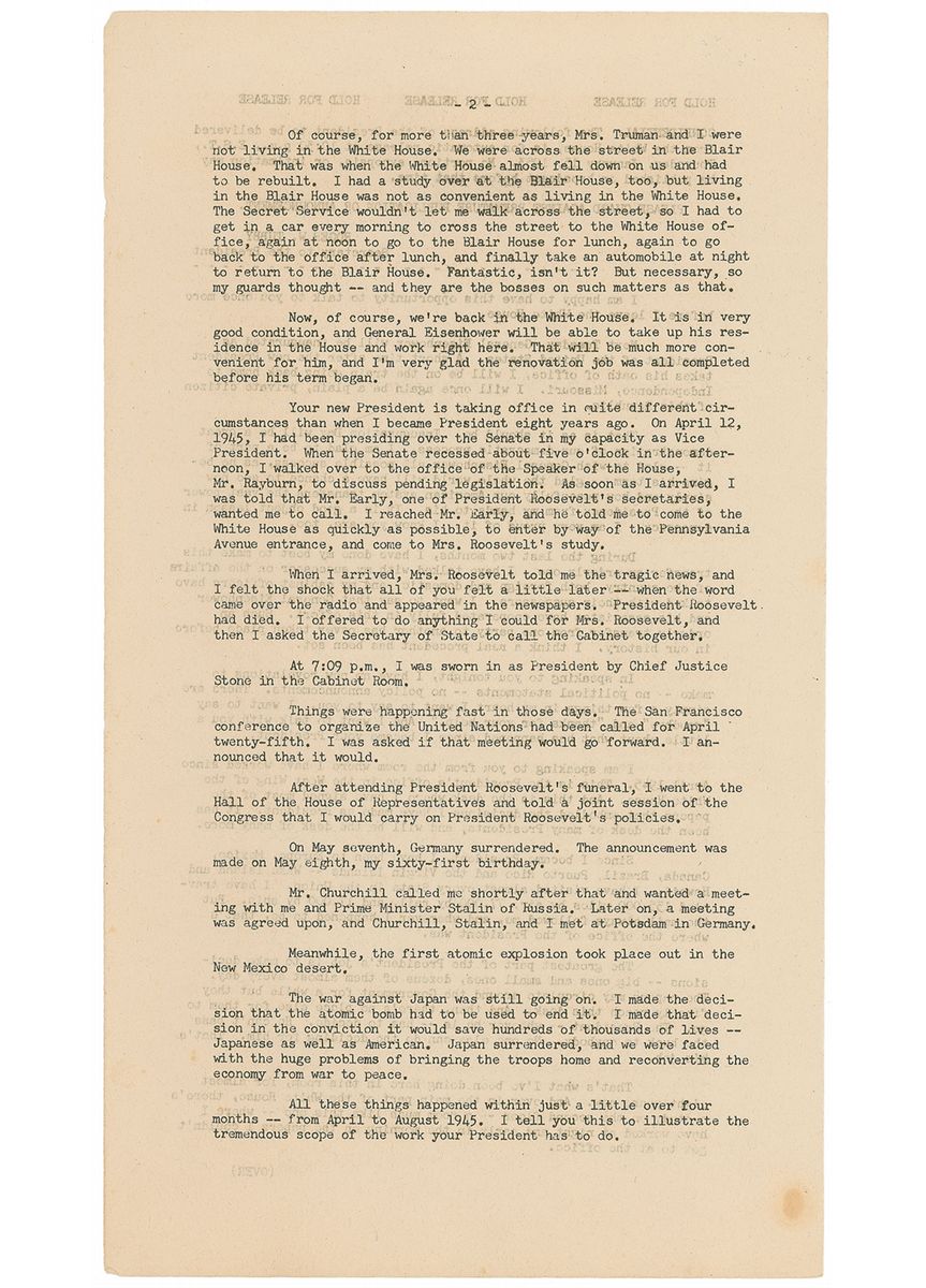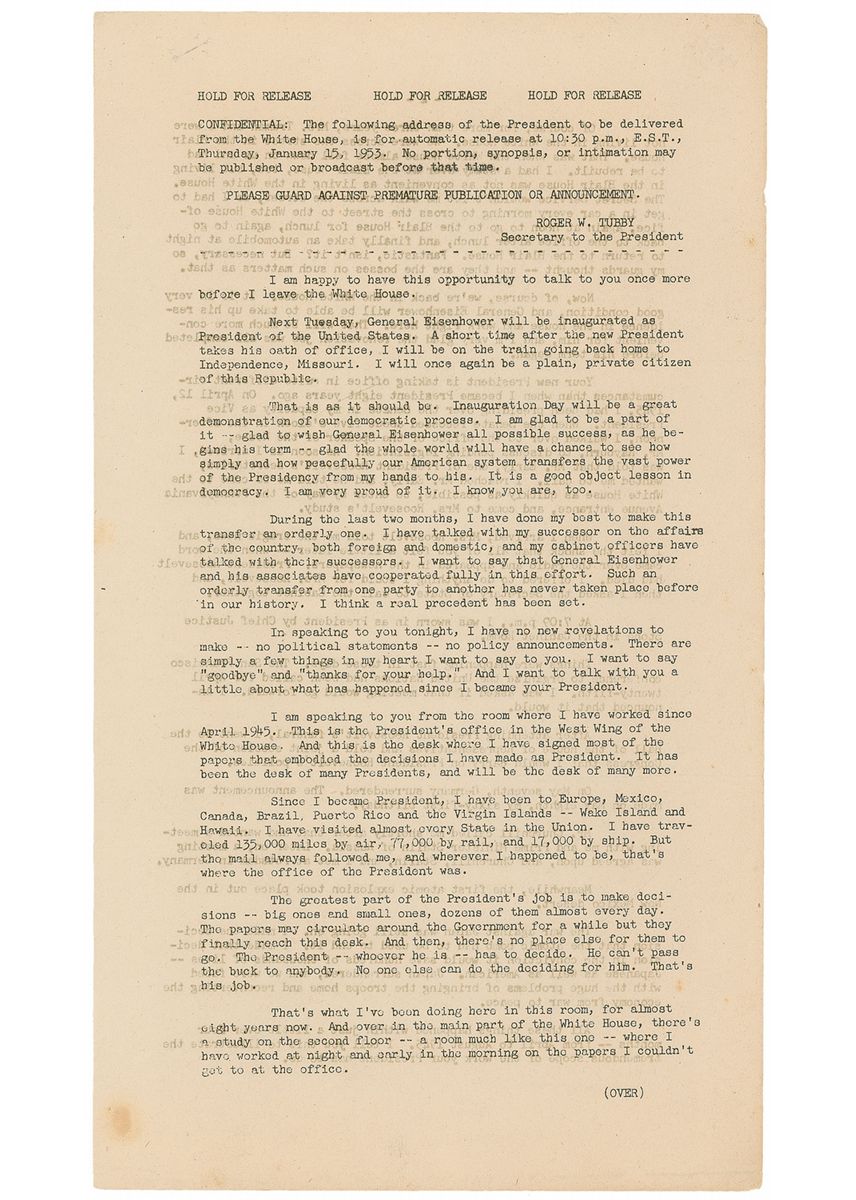 Original mimeographed official White House press release of Truman’s farewell address, three pages both sides, 8 x 14, delivered on January 15, 1953, signed at the conclusion in fountain pen, “Harry S. Truman.” The press release is headed by a message from Secretary to the President Roger W. Tubby, marking the release as “CONFIDENTIAL” and saying that “no portion, synopsis, or intimation may be published or broadcast” prior to the address. Truman’s address, in part: “I am happy to have this opportunity to talk to you once more before I leave the White House. Next Tuesday, General Eisenhower will be inaugurated as President of the United States. A short time after the new President takes his oath of office…Inauguration Day will be a great demonstration of our democratic process. I am glad to be a part of it—glad to wish General Eisenhower all possible success, as he begins his term—glad the whole world will have a chance to see how simply and how peacefully our American system transfers the vast power of the Presidency from my hands to his. It is a good object lesson in democracy. I am very proud of it. And I know you are, too…