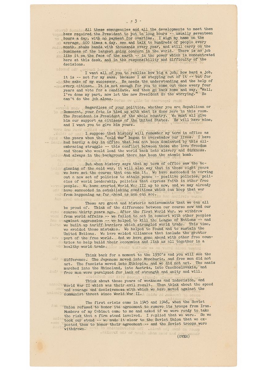 I suppose that history will remember my term in office as the years when the 'cold war' began to overshadow our lives. I have had hardly a day in office that has not been dominated by this all-embracing struggle-this conflict between those who love freedom and those who would lead the world back into slavery and darkness. And always in the background there has been the atomic bomb. But when history says that my term of office saw the beginning of the cold war, it will also say that in those 8 years we have set the course that can win it. We have succeeded in carving out a new set of policies to attain peace—positive policies, policies of world leadership, policies that express faith in other free people...