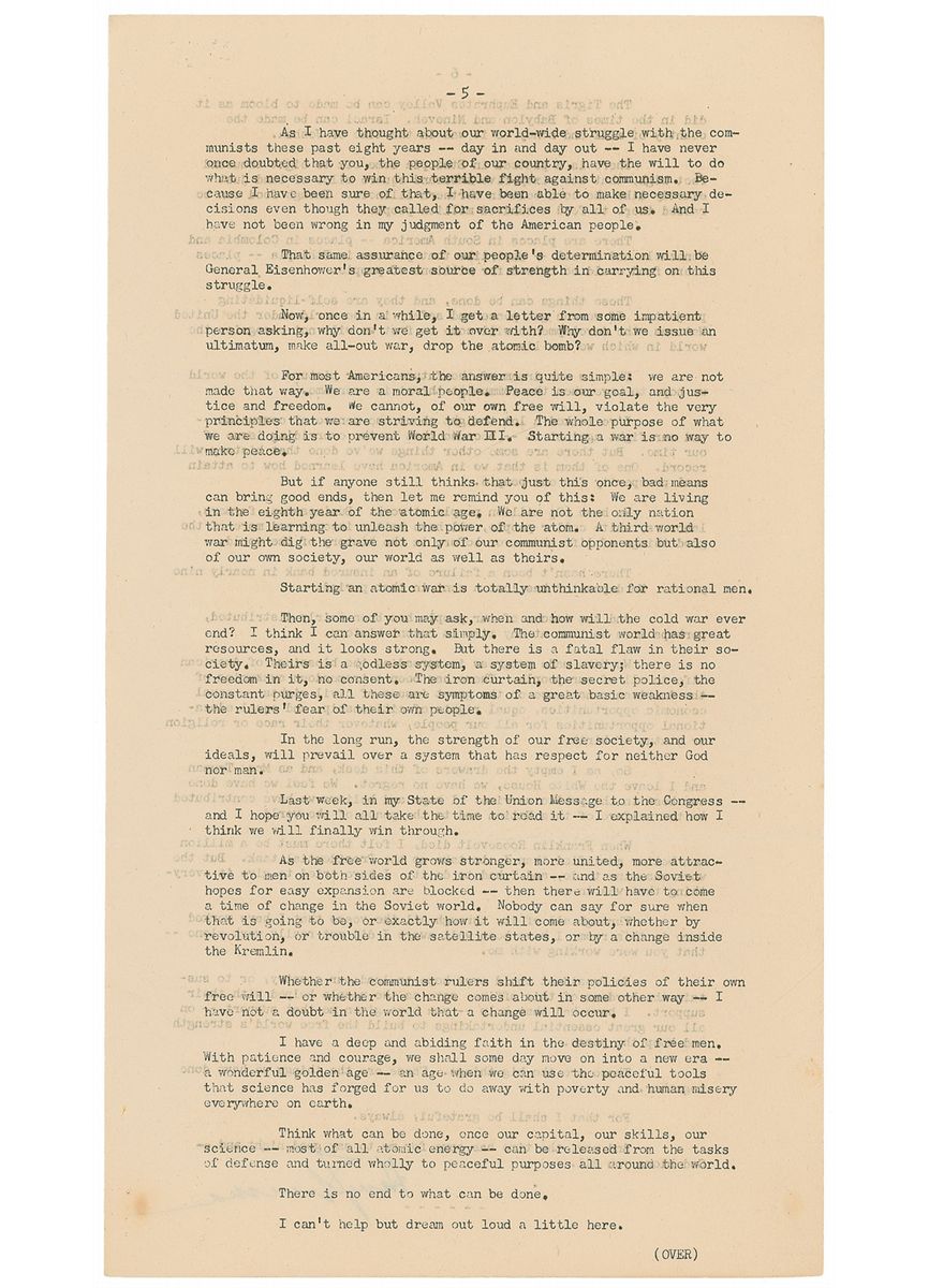 These are great and historic achievements that we can all be proud of. Think of the difference between our course now and our course 30 years ago…In Korea, our men are fighting as valiantly as Americans have ever fought-because they know they are fighting in the same cause of freedom in which Americans have stood ever since the beginning of the Republic. Where free men had failed the test before, this time we met the test. We met it firmly. We met it successfully. The aggression has been repelled. The Communists have seen their hopes of easy conquest go down the drain. The determination of free people to defend themselves has been made clear to the Kremlin…That same assurance of our people's determination will be General Eisenhower's greatest source of strength in carrying on this struggle. Now, once in a while, I get a letter from some impatient person asking, why don't we get it over with? Why don't we issue an ultimatum, make all-out war, drop the atomic bomb? For most Americans, the answer is quite simple: We are not made that way…Starting a war is no way to make peace…Starting an atomic war is totally unthinkable for rational men.