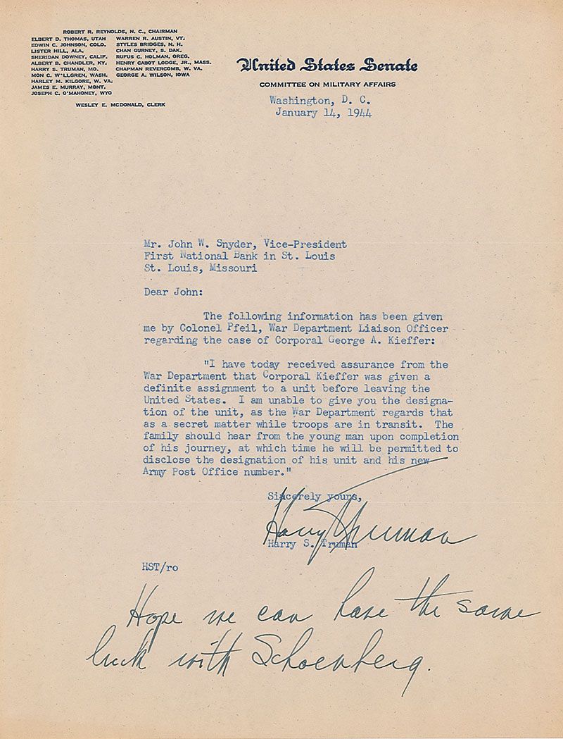 World War II–dated TLS, one page, 8 x 10.5, US Senate letterhead, January 14, 1944. Letter to John W. Snyder. In full: “The following information has been given me by Colonel Pfeil, War Department Liaison Officer regarding the case of Corporal George A. Kieffer: ‘I have today received assurance from the War Department that Corporal Kieffer was given a definite assignment to a unit before leaving the United States. I am unable to give you the designation of the unit, as the War Department regards that as a secret matter while troops are in transit. The family should hear from the young man upon completion of his journey, at which time he will be permitted to disclose the designation of his unit and his new Army Post Office number.” Truman adds a handwritten postscript at the conclusion, “Hope we can have the same luck with Schoenberg.” In fine condition.