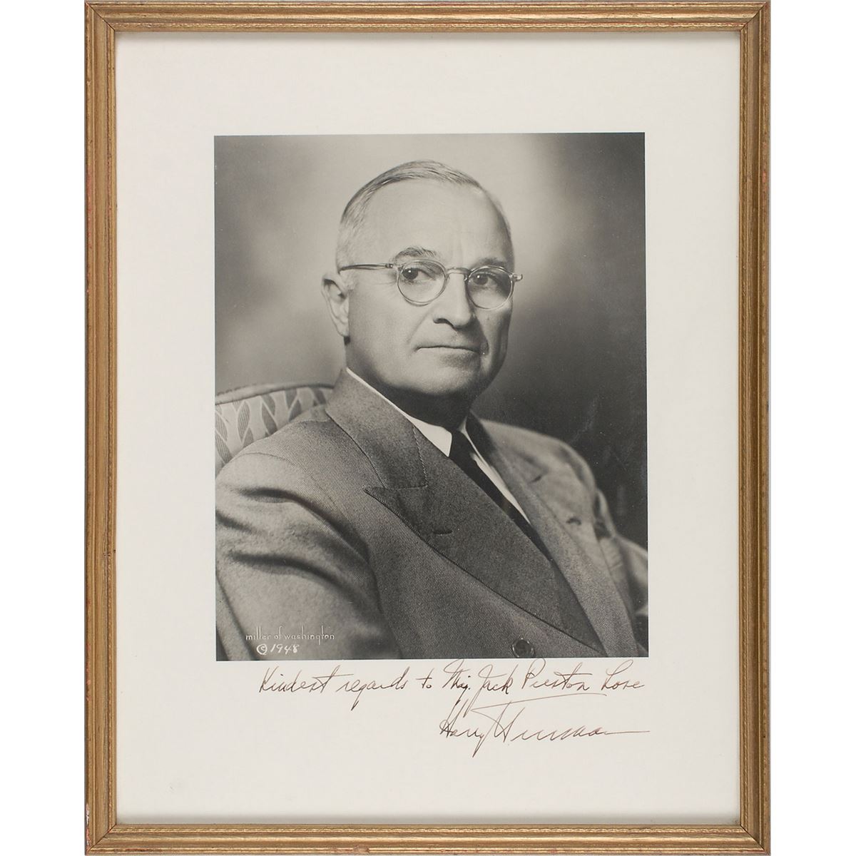 Dignified matte-finish 10.25 x 13.75 head-and-shoulders portrait of Truman, signed and inscribed in the lower border in fountain pen, “Kindest regards to Maj. Jack Preston Lore, Harry Truman.” Bears a 1948 Miller of Washington copyright notice in the lower left of the image. Framed to an overall size of 11.75 x 14.75. In fine condition.