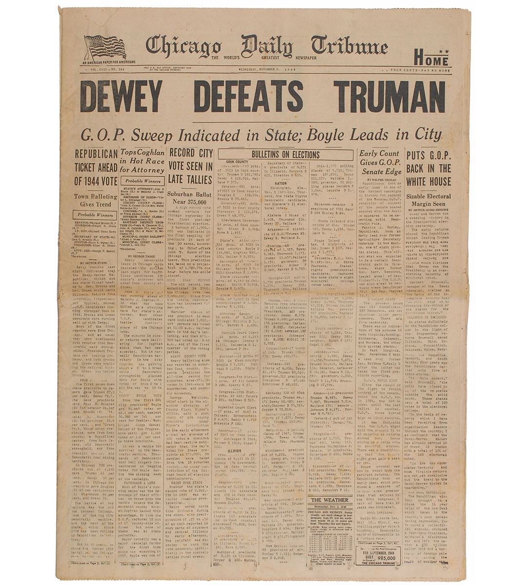 Rare complete issue of the Chicago Daily Tribune of November 3, 1948, 17 x 24, featuring the iconic banner headline "Dewey Defeats Truman.” In fine condition, with a few small tears and wear to the spine, a repaired tear to the upper left, and an unobtrusive area of paper loss to the top edge. When the decision to print this paper was made, returns were coming in very slowly and time was running out before the deadline for the edition. The Tribune staff, based on the early returns, decided Dewey would be the next President. After the newspaper was delivered to the street, more returns came in and showed that Truman would in fact be reelected. The already delivered ‘error’ newspapers were gathered for return by staff members sent out to pick them up from newsstands and homes in the Chicago area. Original, entirely complete editions of this newspaper are becoming increasingly scarce.