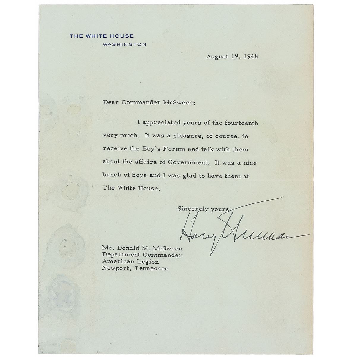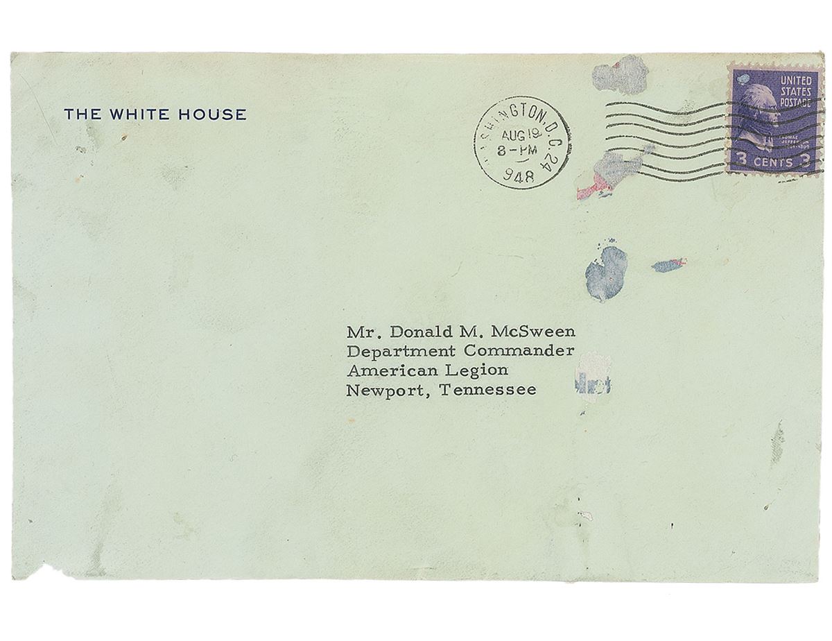 TLS as president, one page, 7 x 8.75, White House letterhead, August 19, 1948. Letter to Commander Donald McSween, in full: “I appreciated yours of the fourteenth very much. It was a pleasure, of course, to receive the Boy’s Forum and talk with them about the affairs of Government. It was a nice bunch of boys and I was glad to have them at The White House.” In very good condition, with scattered adhesive along left side. Accompanied by the addressed side of the original mailing envelope.