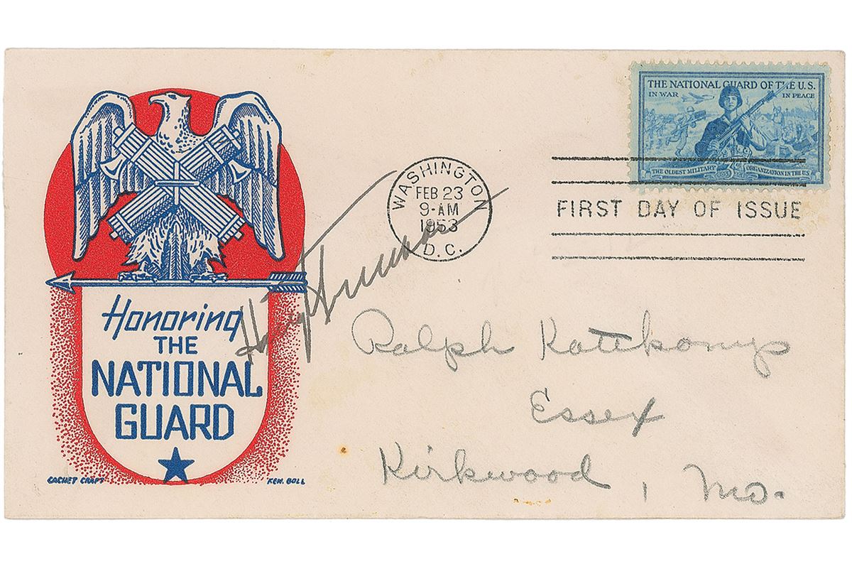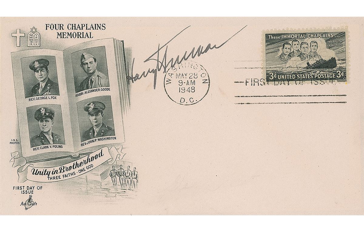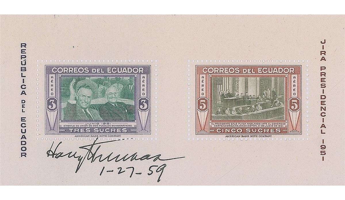 Nice collection of three items signed in fountain pen by Truman, including two FDCs with cachets honoring the military and an Ecuadorian stamp block. The address area of one FDC is filled out in pencil in another hand. In overall fine condition.