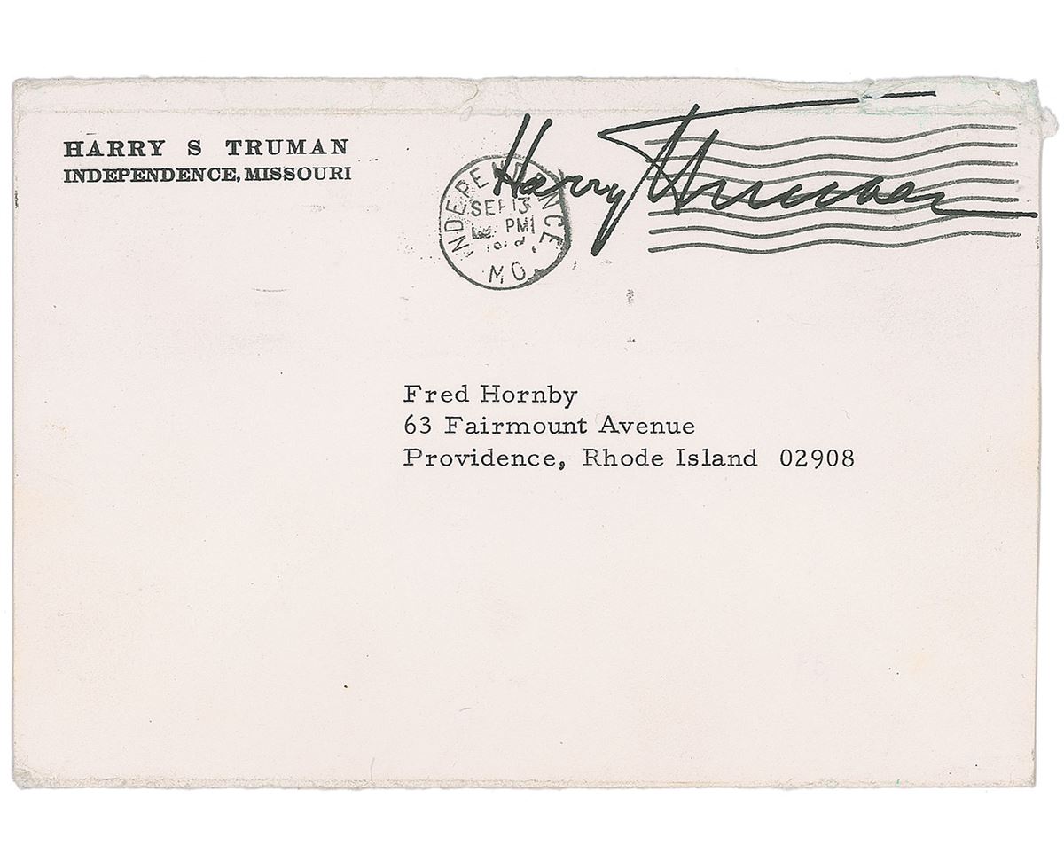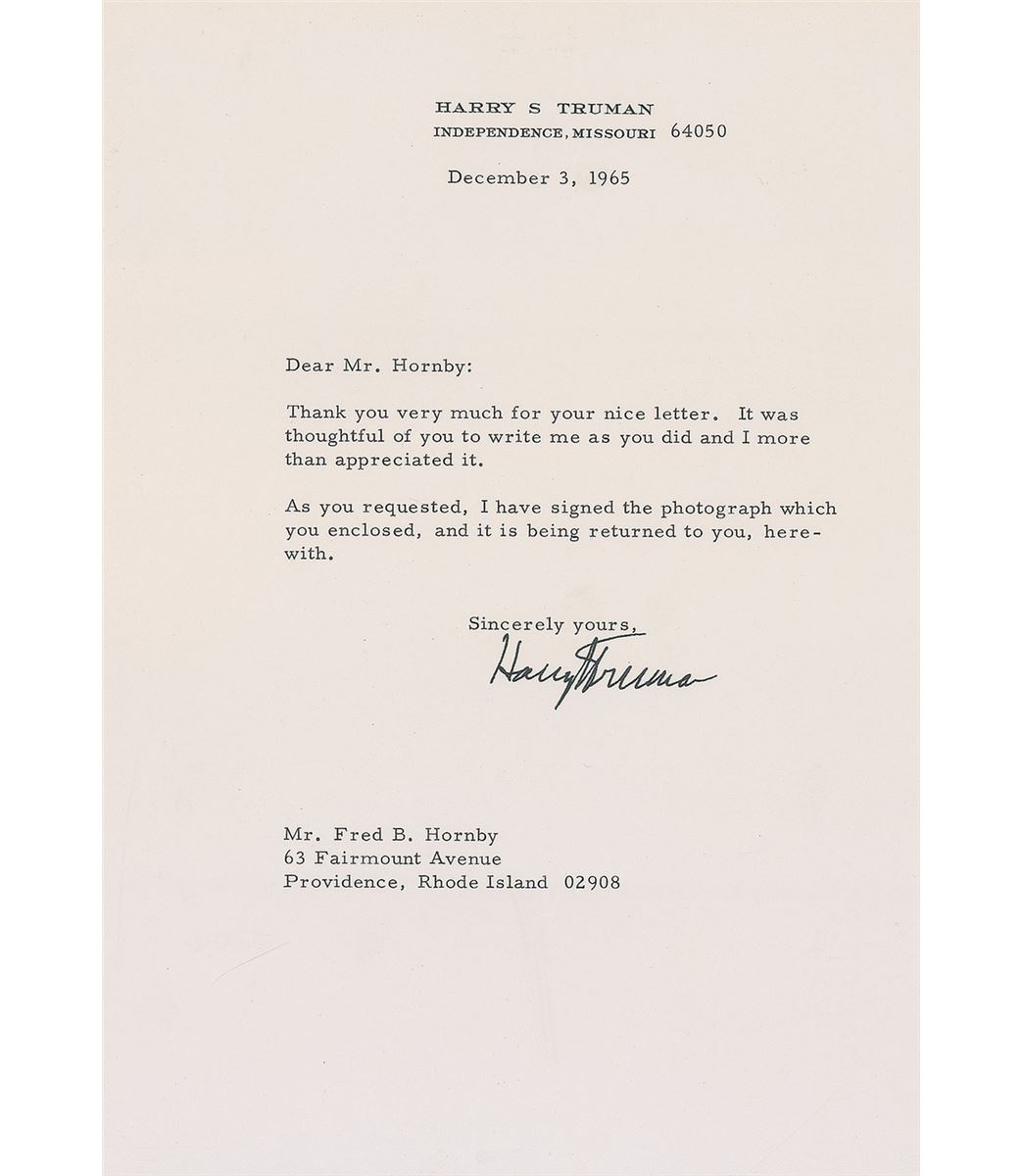 TLS, one page, 6.75 x 9.75, personal letterhead, December 3, 1965. Letter to Fred Hornby, in full: “Thank you very much for your nice letter. It was thoughtful of you to write me as you did and I more than appreciated it. As you requested, I have signed the photograph which you enclosed, and it is being returned to you, herewith.” In fine condition, with a slightly trimmed right edge. Accompanied by the original mailing address, with a stamped free frank in the upper right.