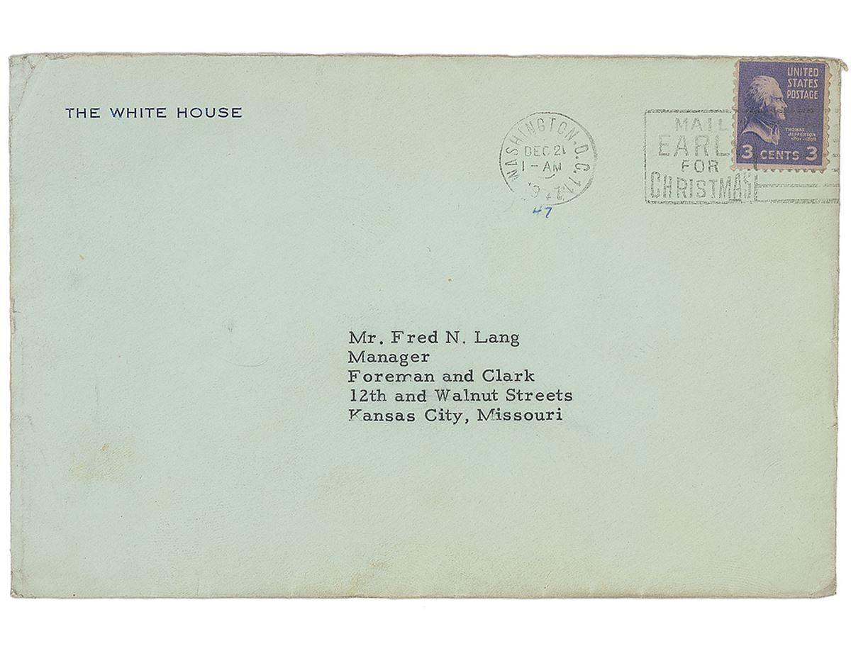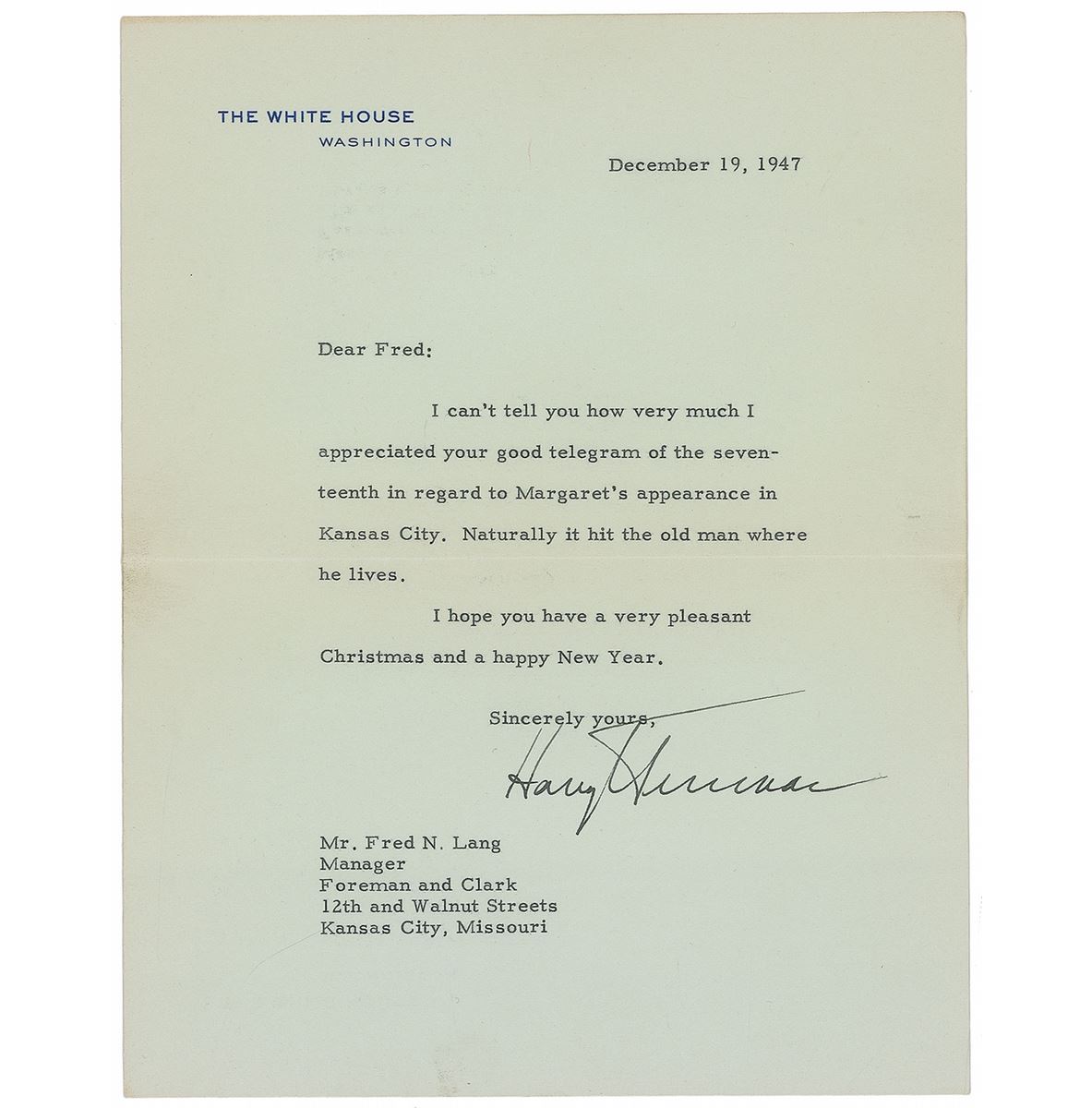 TLS as president, one page, 7 x 9, White House letterhead, December 19, 1947. Letter to Fred Lang, in part: “I can’t tell you how very much I appreciated your good telegram of the seventeenth in regard to Margaret’s appearance in Kansas City. Naturally it hit the old man where he lives.” In fine condition, with trivial creasing to left edge. Accompanied by the original mailing envelope. The year of 1947 proved an integral one for budding opera singer Margaret Truman who, following her national radio debut in mid-March, appeared in several large-scale public performances around the country, including her aforementioned Kansas City concert on December 15, 1947.