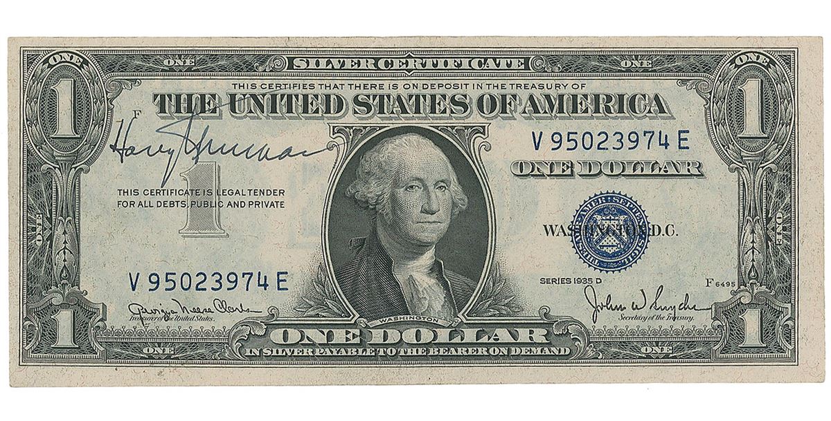 Series 1935 D silver certificate one dollar bill, signed on the portrait side in fountain pen. Central vertical fold and slight scattered creasing, otherwise fine condition. A highly desirable banknote, bringing to mind Truman’s famous desk sign, ‘The buck stops here!’