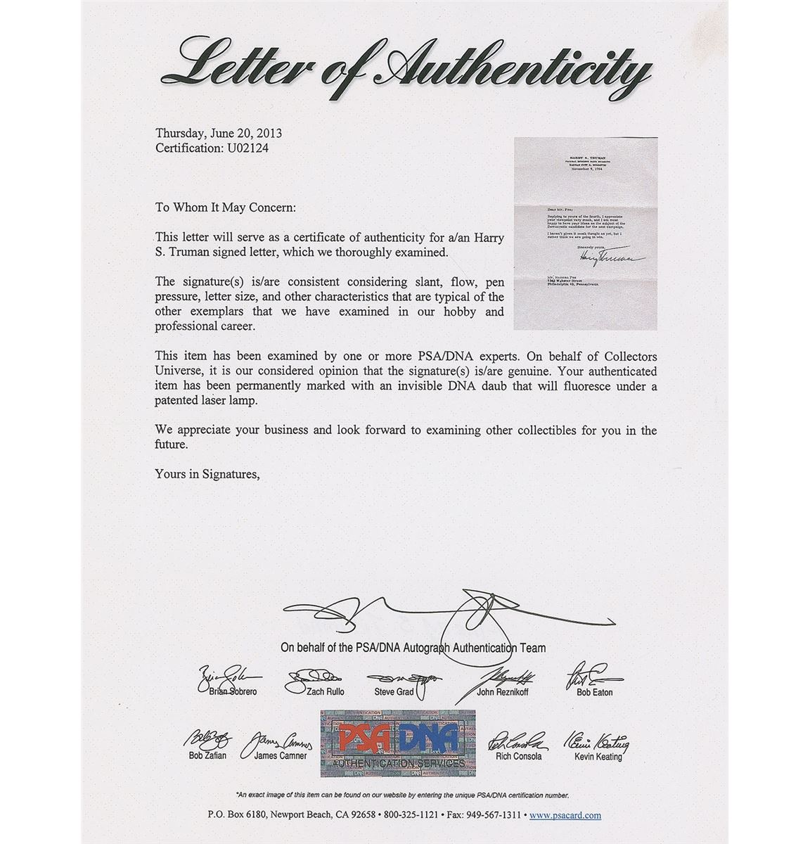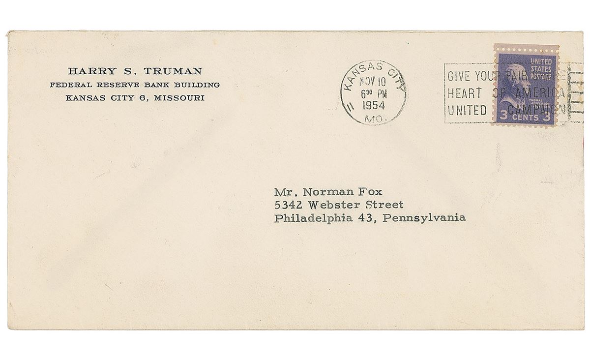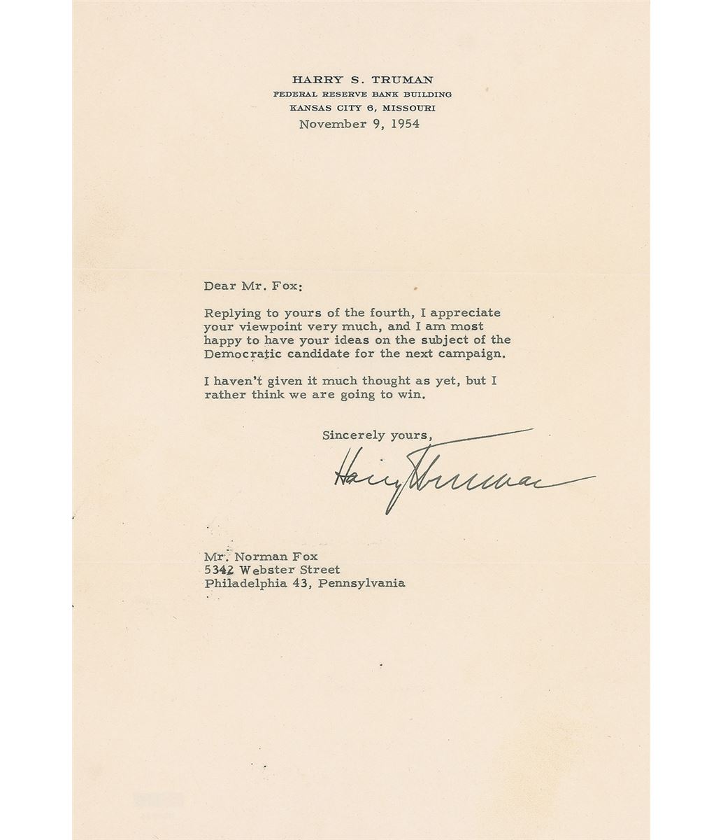 TLS, one page, 7.25 x 10.5, personal letterhead, September 9, 1954. Letter to Norman Fox, in full: “Replying to yours of the fourth, I appreciate your viewpoint very much, and I am most happy to have your ideas on the subject of the Democratic candidate for the next campaign. I haven’t given it much thought as yet, but I rather think we are going to win.” In fine condition, with a PSA/DNA label affixed to the reverse. Accompanied by the original mailing envelope and a full letter of authenticity from PSA/DNA.
